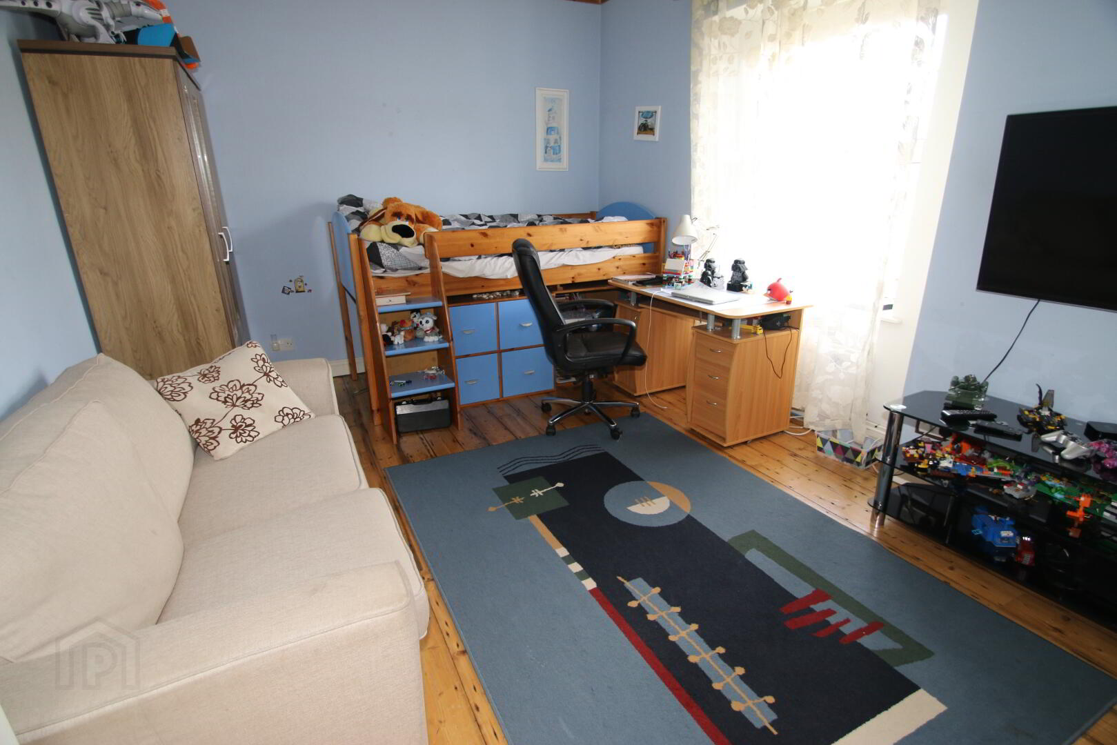 Centre light, picture rail, double radiator, 2 double power points, original wooden floor boards, thermostat.