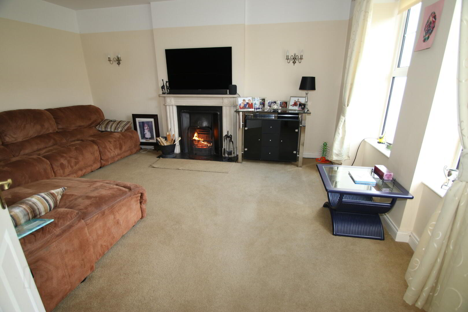 2 wall lights, centre light, 2 windows, carpeted, TV point, 2 double power points, double radiator, telephone point, limestone fireplace with cast iron insert and slate hearth (suitable for solid fuel).
