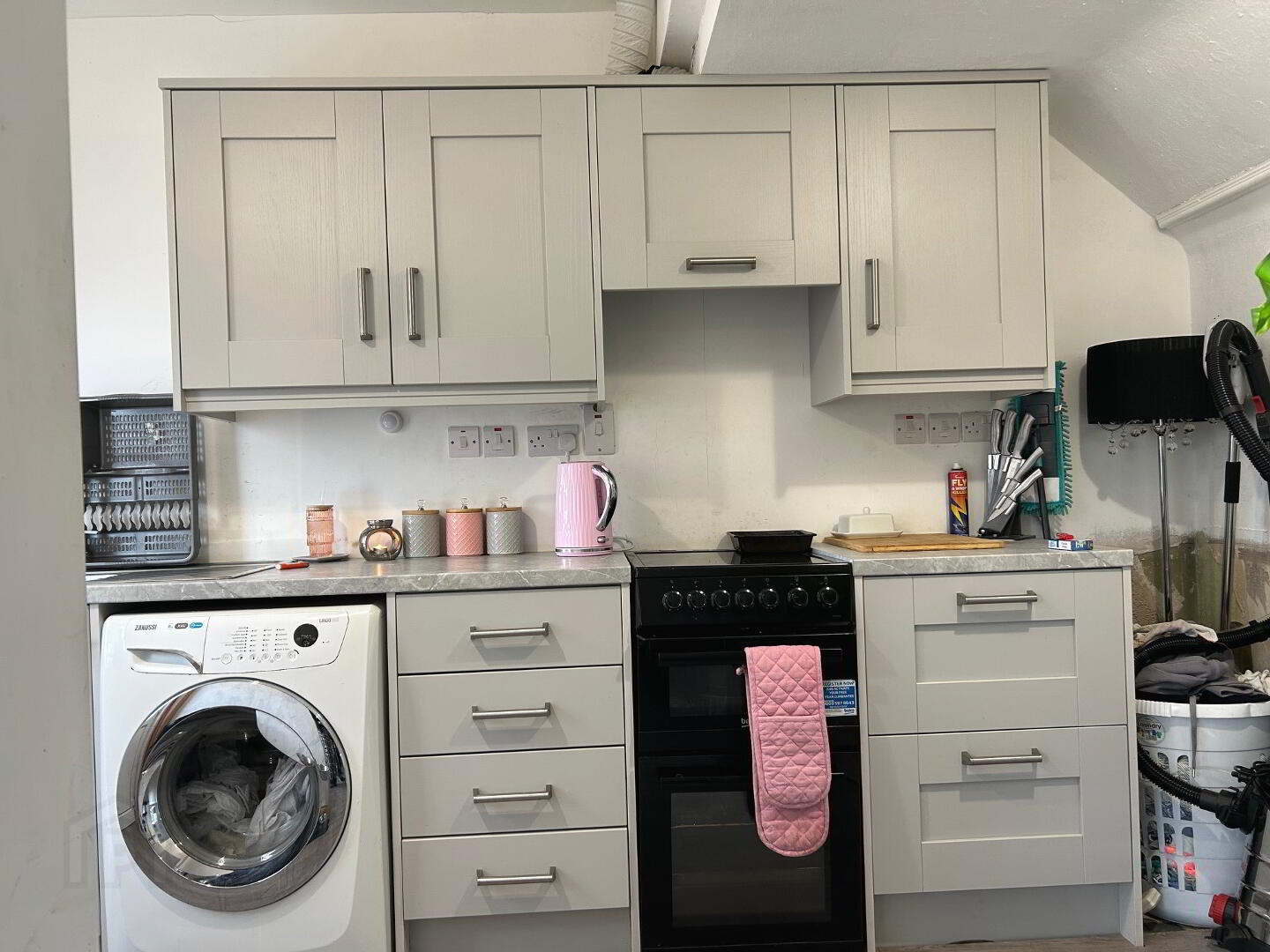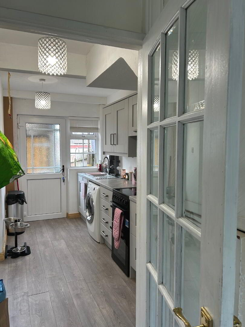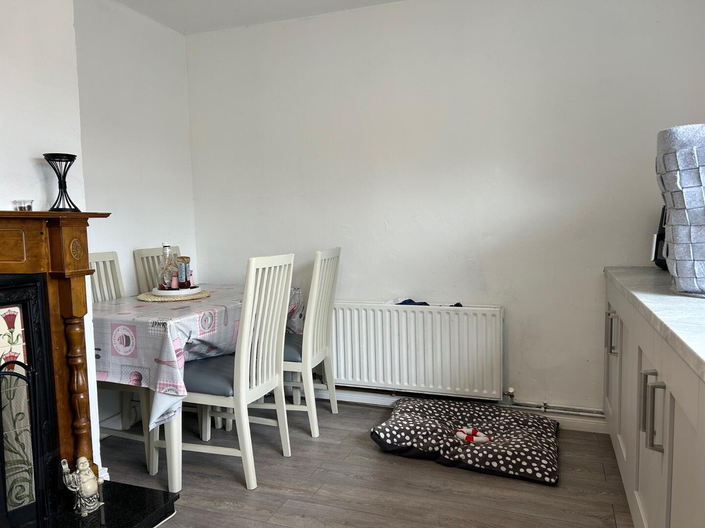 3 centre lights, laminate floor, 2 double radiators, grey high and low level kitchen units, stainless steel sink, central heating control, thermostat, space for cooker and American style fridge freezer, plumbed for washing machine, integrated extractor fan, 6 double power points, pine fireplace with decorative cast iron style insert with tiles and granite hearth, UPVC half glazed external door to rear.