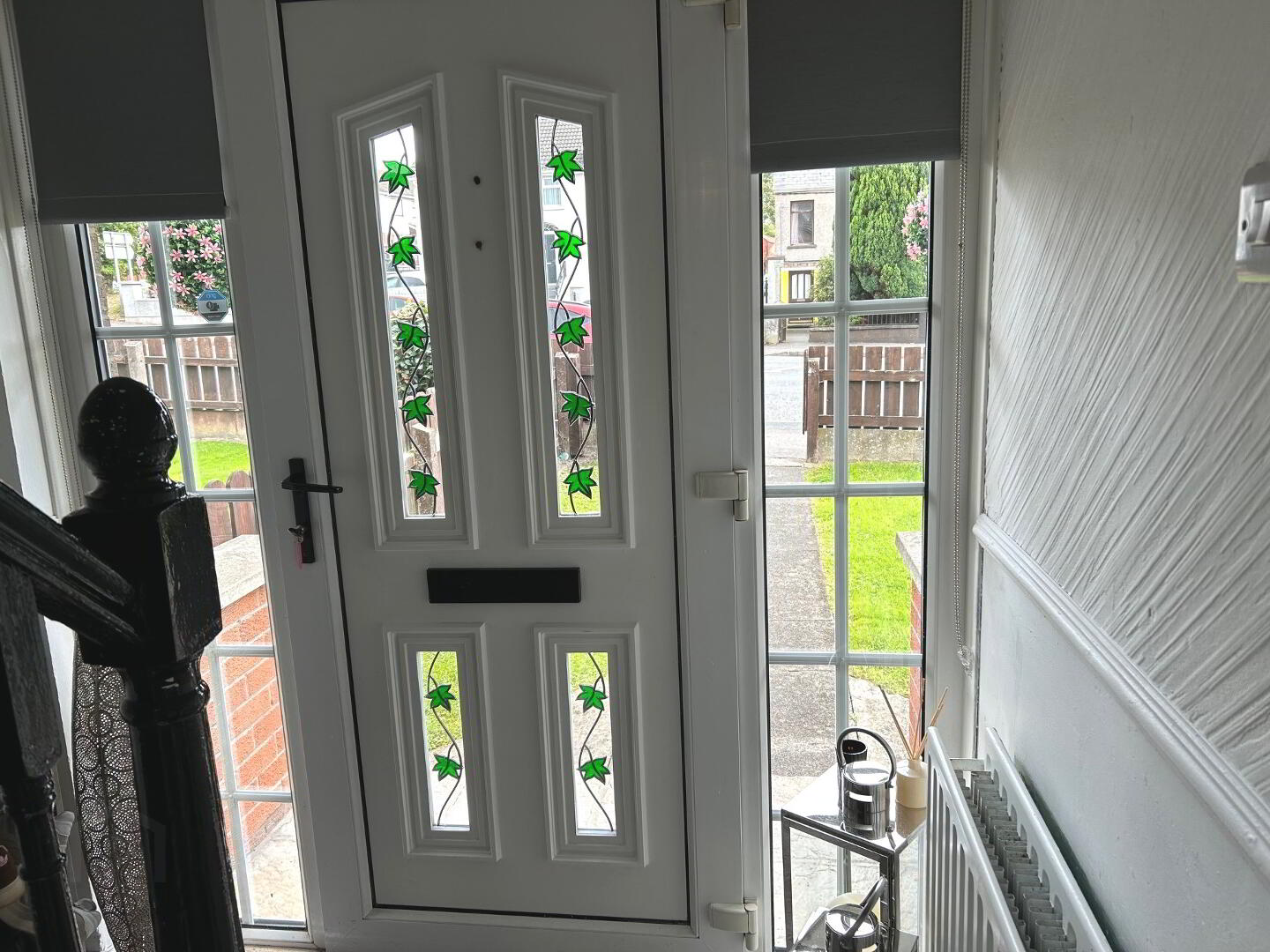Centre light, double radiator, laminate floor, understairs storage cupboard, 1 single power point, UPVC entrance door with decorative glass insert and 2 glass panels to side.