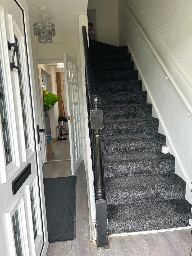 Centre light, stairs and landing carpeted, shelved airing cupboard.