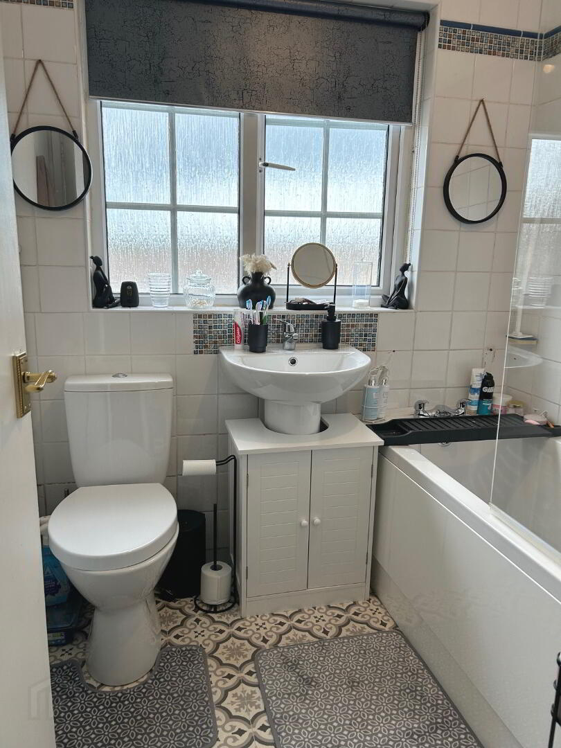 Centre light, vinyl floor covering, partly wall tiled, white bathroom suite consisting of toilet, pedestal wash hand basin and bath with Triton electric shower over.