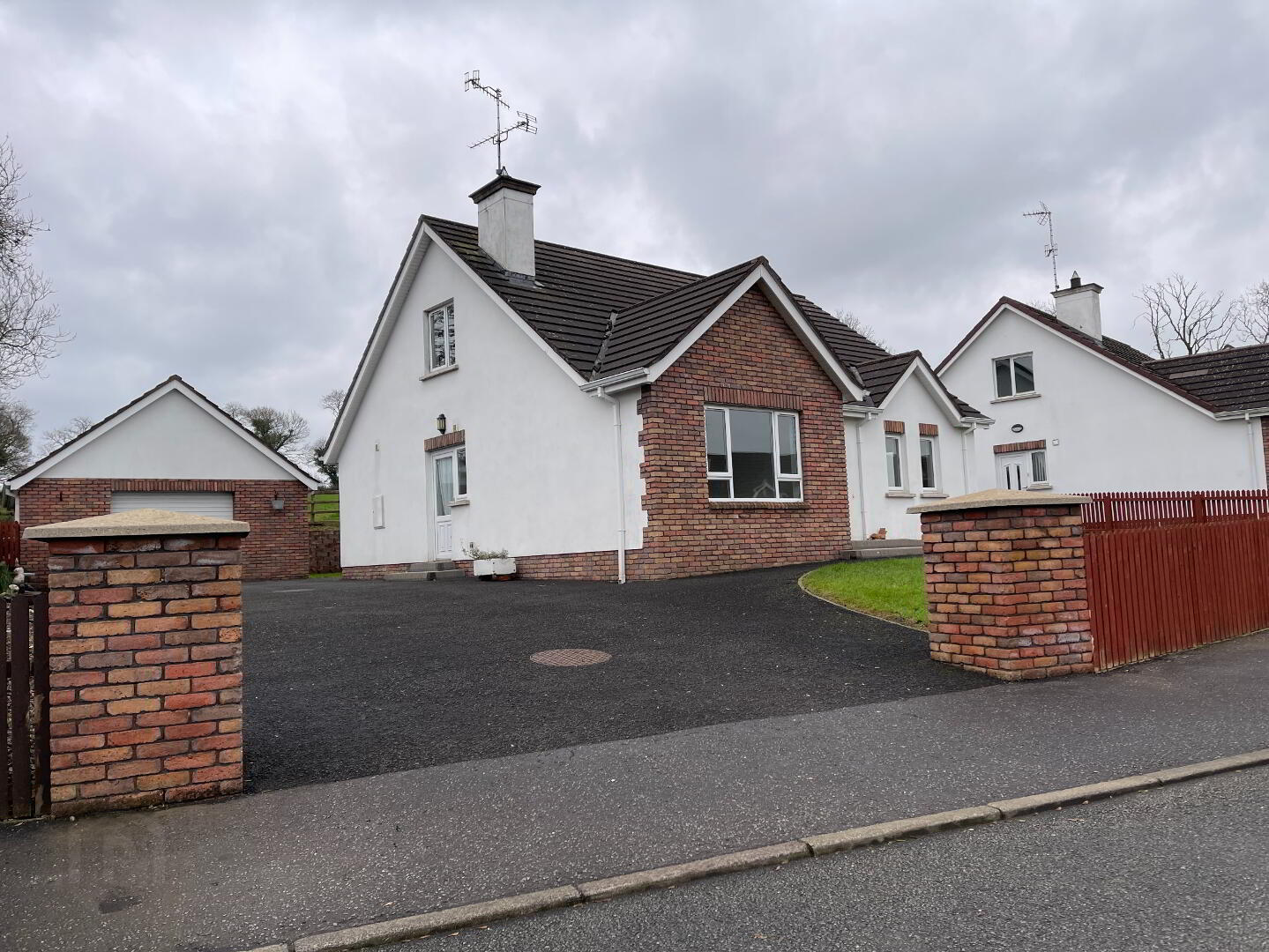 Tarred drive, entrance pillars, lawn, fenced on 3 sides, outside lighting.