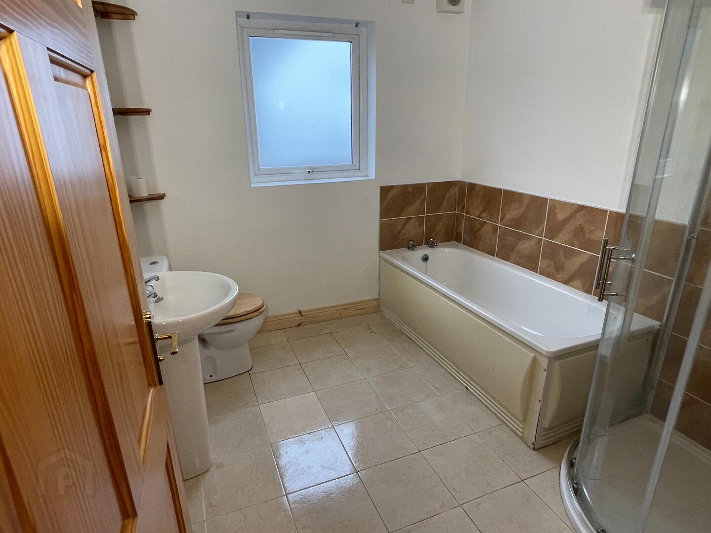 Centre light, extractor fan, tiled floor, partly wall tiled, single radiator, white bathroom suite consisting of toilet, pedestal wash hand basin and bath, walk-in shower.
