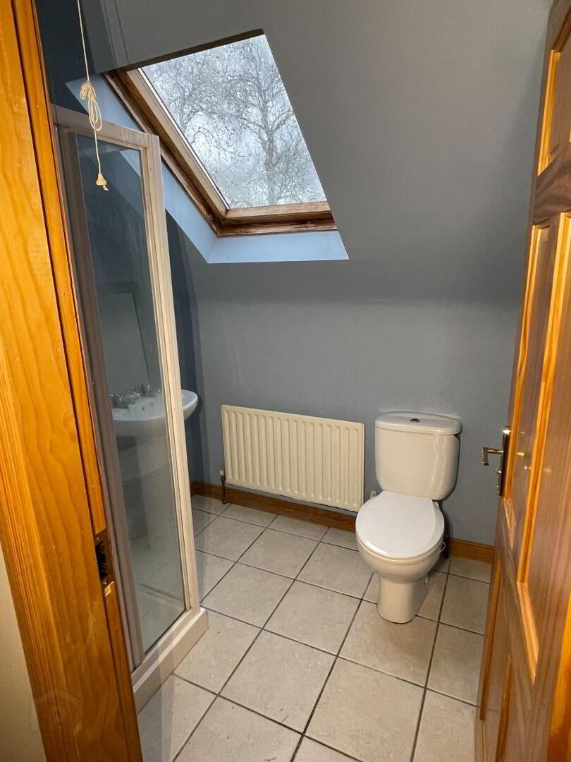 Centre light, extractor fan, tiled floor, partly wall tiled, single radiator, Keylite roof window, white toilet, pedestal wash hand basin, walk-in Redring Expression electric shower.