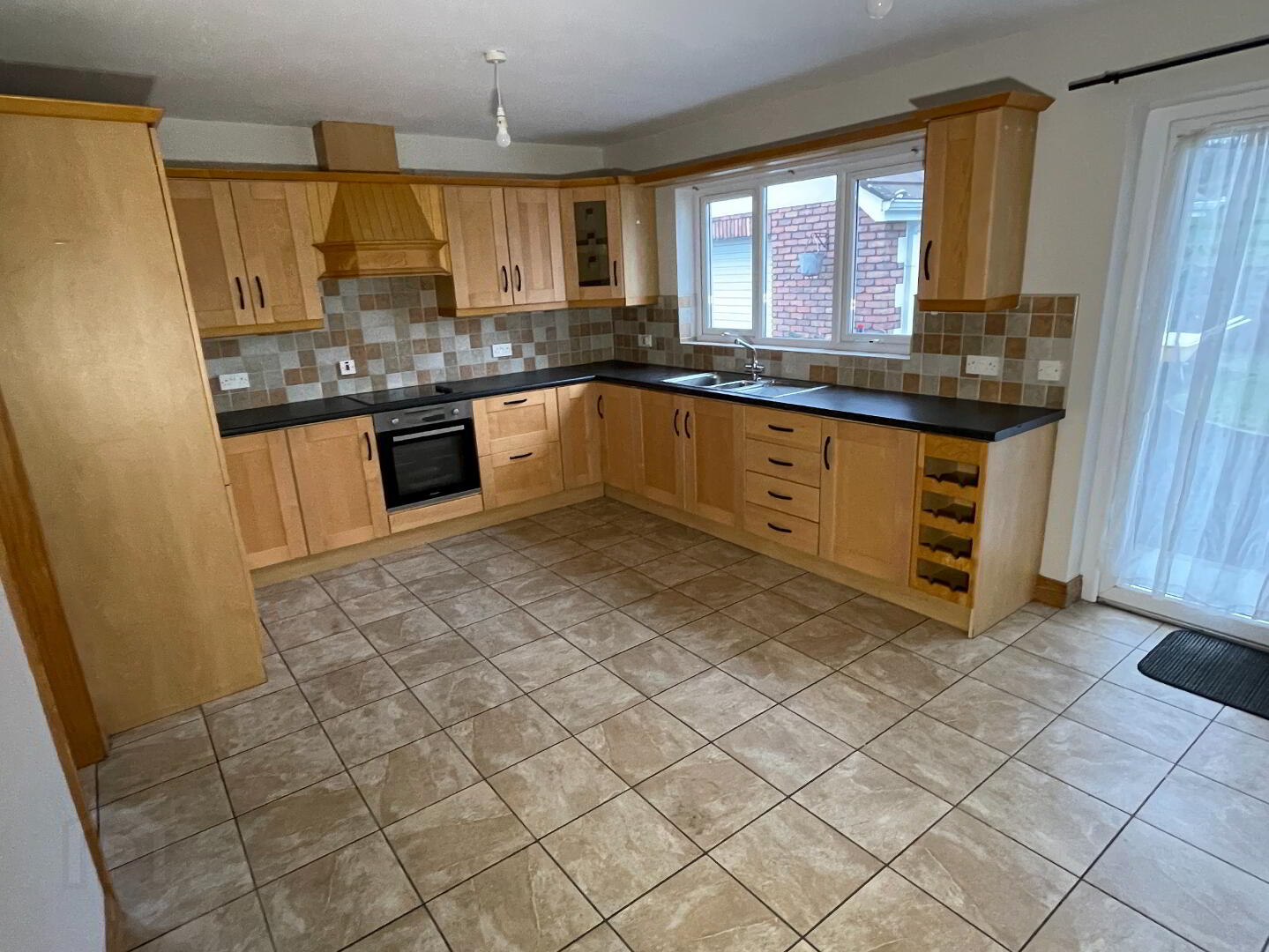 2 centre lights, tiled floor, partly wall tiled, high and low level kitchen units, 2 glass display units, wine rack, TV point, 5 double power points, Hotpoint integrated glass hob, Candy integrated electric cooker, integrated extractor fan, Hotpoint integrated fridge freezer, stainless steel sink, UPVC glazed French doors to garden.