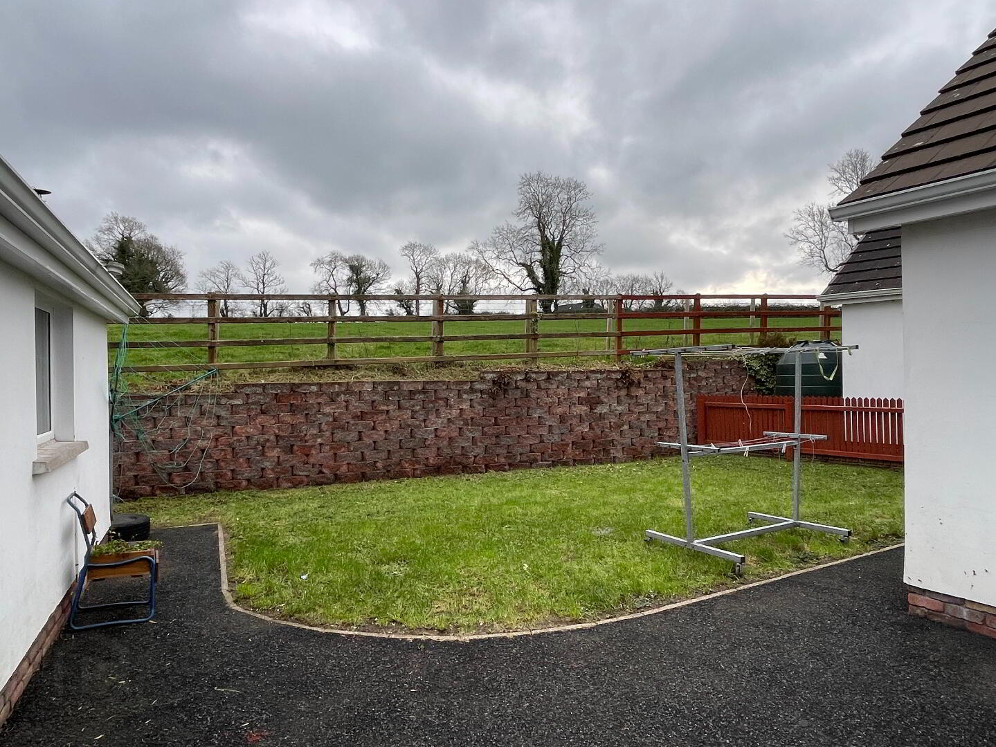 Tarred area, lawn with wall to one side and fence to 2 sides, outside lighting, outside hot and cold water taps outside lighting.