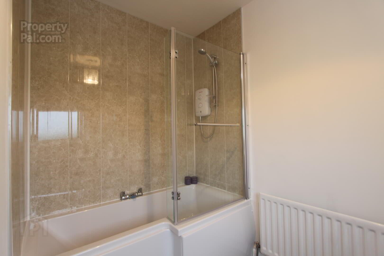 Bathroom – Vinyl flooring with a bath with over head electric shower, wash hand basin vanity unit and toilet. Hot press located within bathroom.