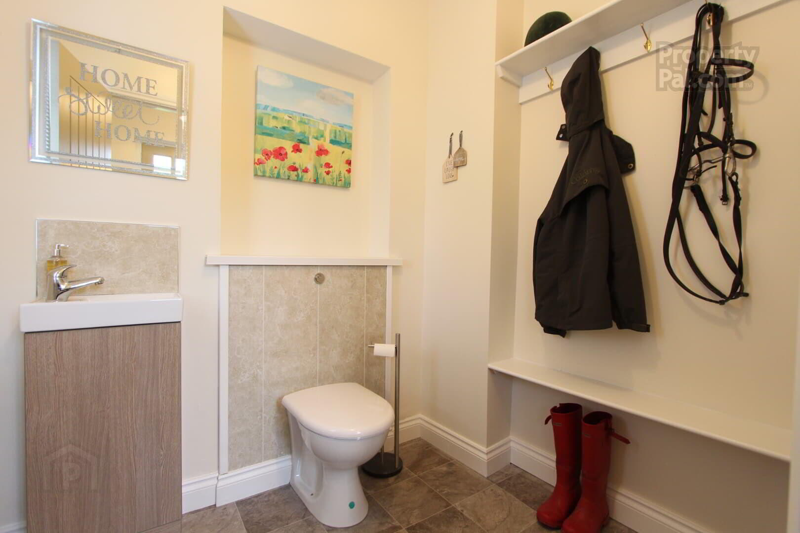 Cloakroom – Vinyl flooring with wash hand basin and toilet.