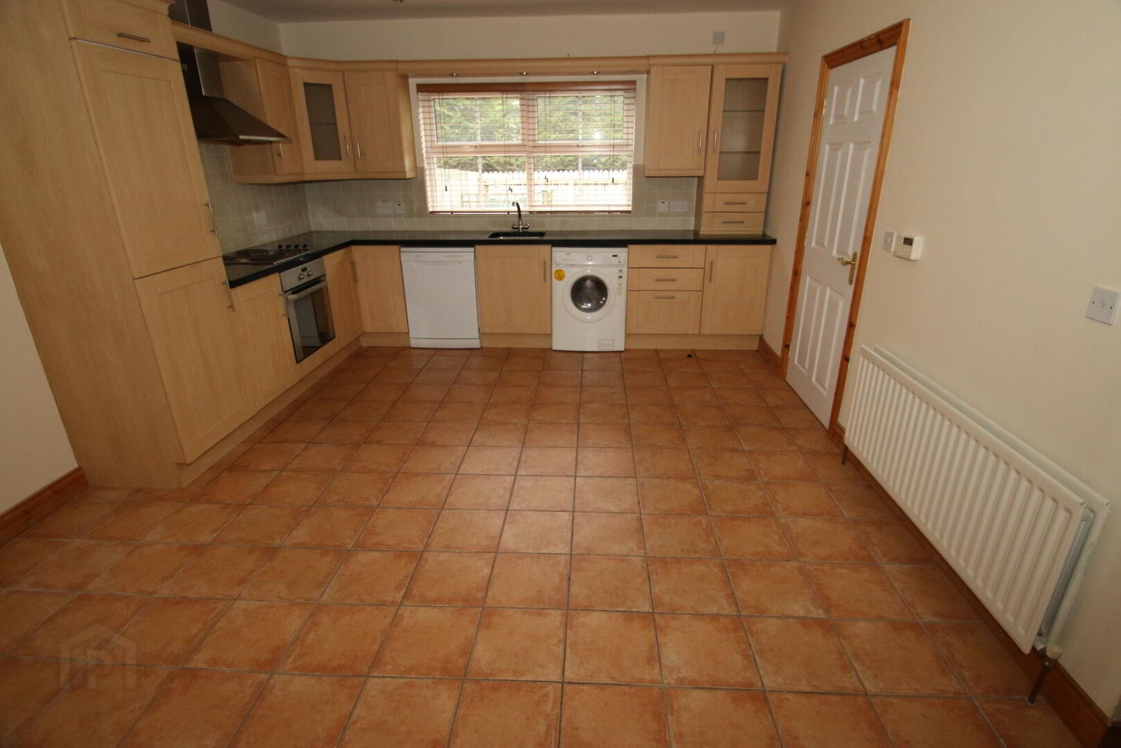 Recessed lighting, tiled floor, double radiator, central heating control, telephone point, 1 single power point, 4 double power points, TV point, high and low level maple style kitchen units, black granite worktops with undermounted stainless steel sink, stainless steel extractor fan, whirlpool integrated electric cooker, integrated hob, space for washing machine and dish washer, partly wall tiled, unit lighting, under stairs storage cupboard (centre light).