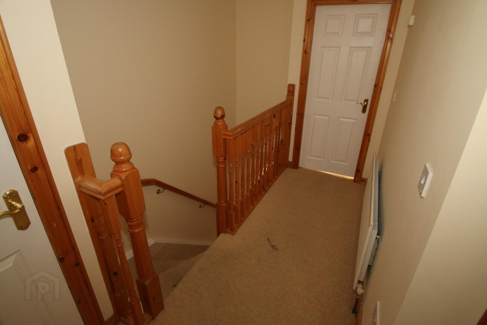 Centre light, stairs and landing carpeted, single radiator, 1 double power point, shelved airing cupboard, thermostat.