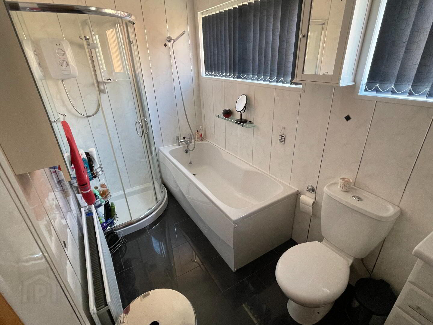 Centre light, UPVC ceiling and wall panelling, tiled floor, double radiator, white bathroom suite consisting of toilet, bath with shower over and wash hand basin in vanity unit, walk-in Redring corner electric shower, 2 mirror wall units, mirror above sink, extractor fan.