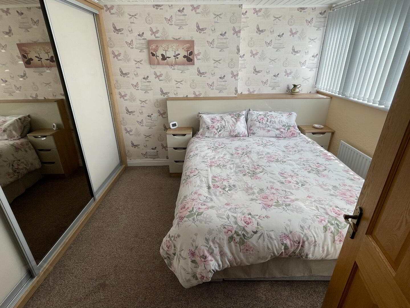 Centre light, recessed lighting, painted tongue and groove ceiling, carpeted, built-in sliding partly mirrored wardrobe with matching built-in headboard and bedside lockers, dressing table, single radiator, 2 double power points, 2 single power points, TV point.