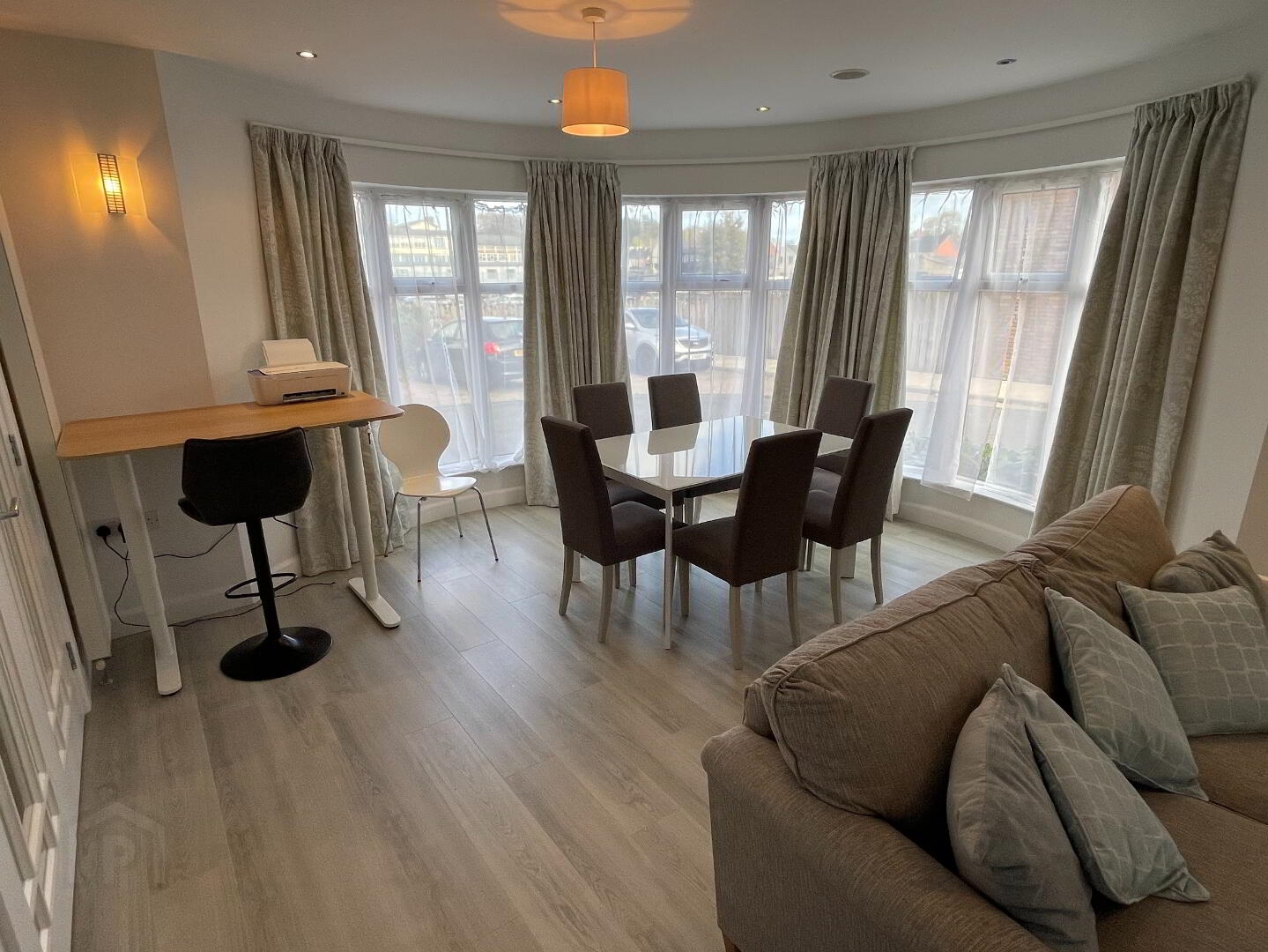 2 centre lights, recessed lighting, 3 wall lights, laminate floor, 2 double wall radiators, white fireplace with feature lights suitable for electric fire, TV point, telephone point, 5 double power points, 4 x 5amp power points, glazed French doors to outside, intercom system, glazed French doors to kitchen.