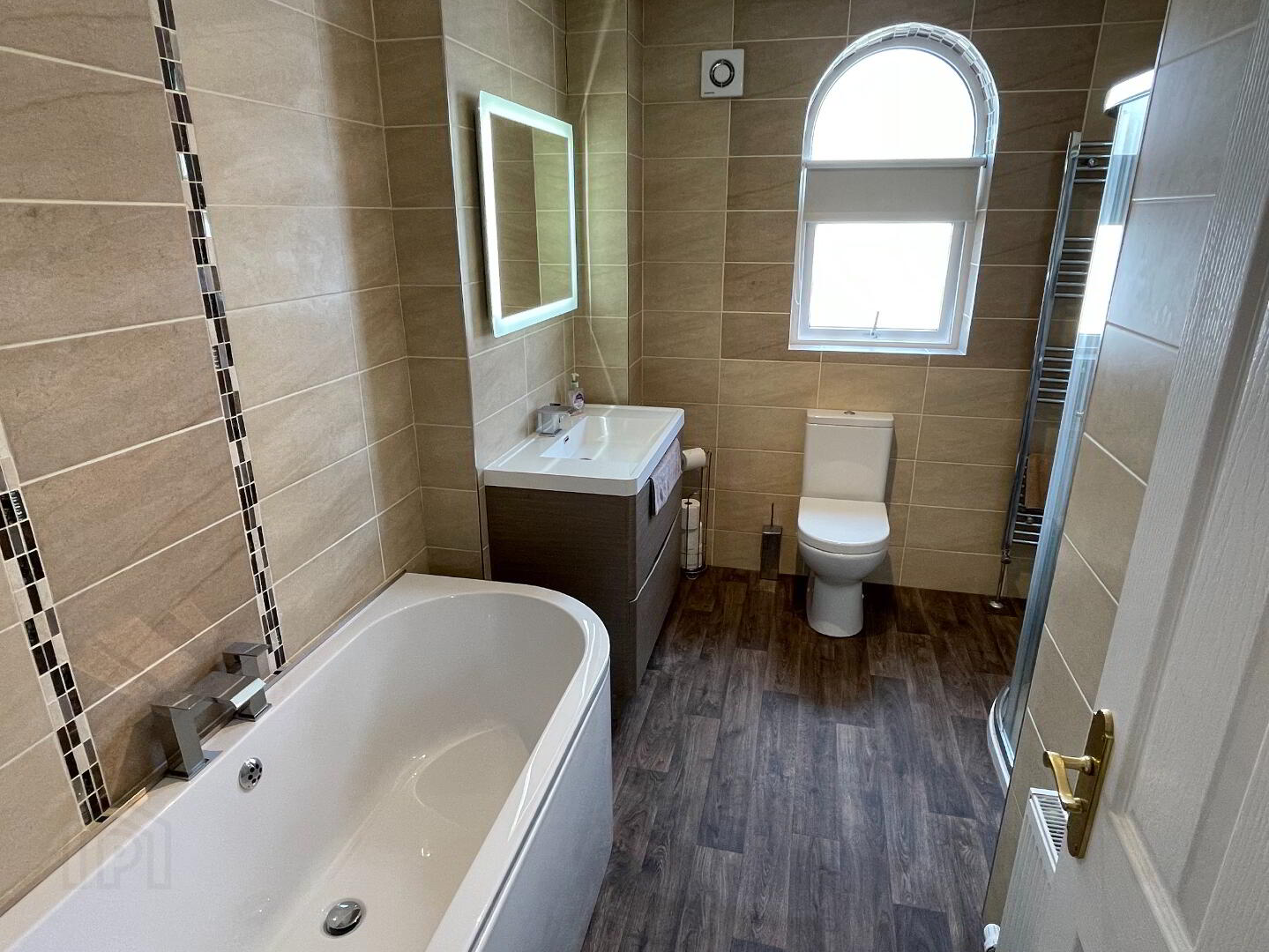 Centre light, extractor fan, single radiator, towel radiator, vinyl floor covering, fully wall tiled, white bathroom suite consisting of wash hand basin in vanity unit, toilet and bath with mixer tap, walk-in shower.
