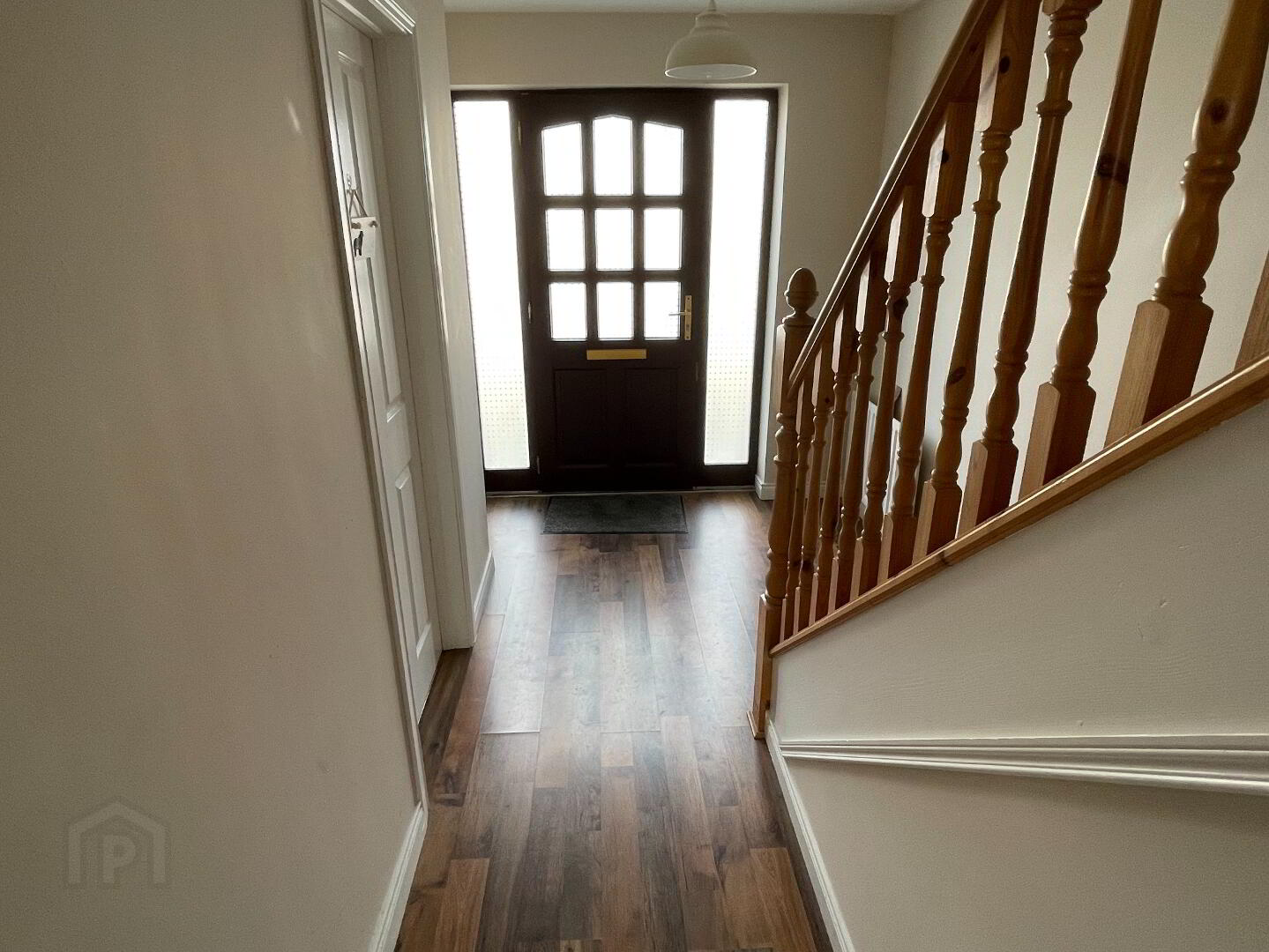2 centre lights, laminate floor, single radiator, mahogany hard wood entrance door with glass inserts and 2 glass side panels, 1 double power point, telephone point.