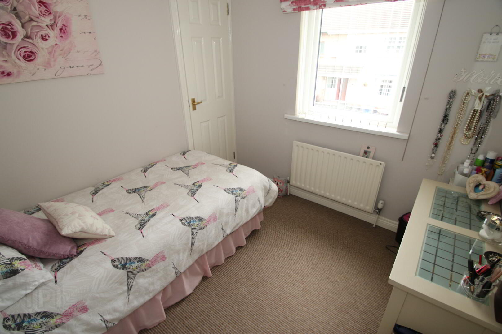 Centre light, carpeted, double radiator, 2 double power points, built-in painted wardrobes.