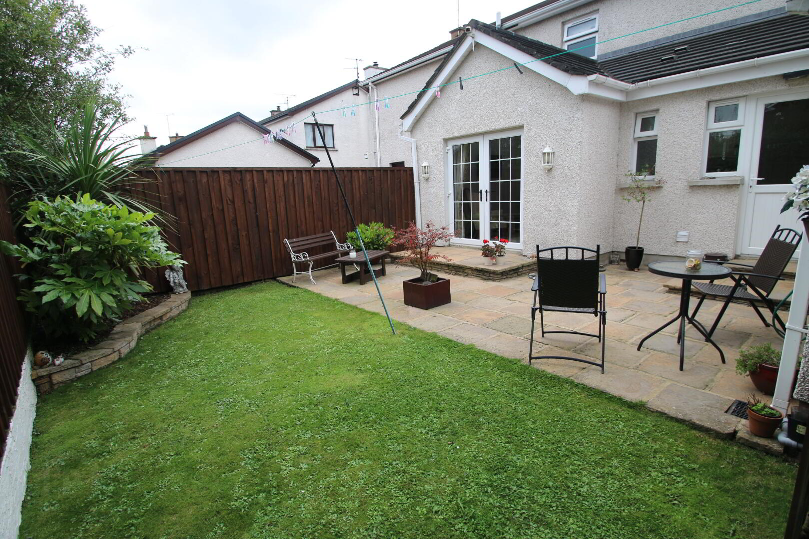 Paved patio area, lawn, fenced on 2 sides, shrub bed, oil tank, oil burner, outside lighting.