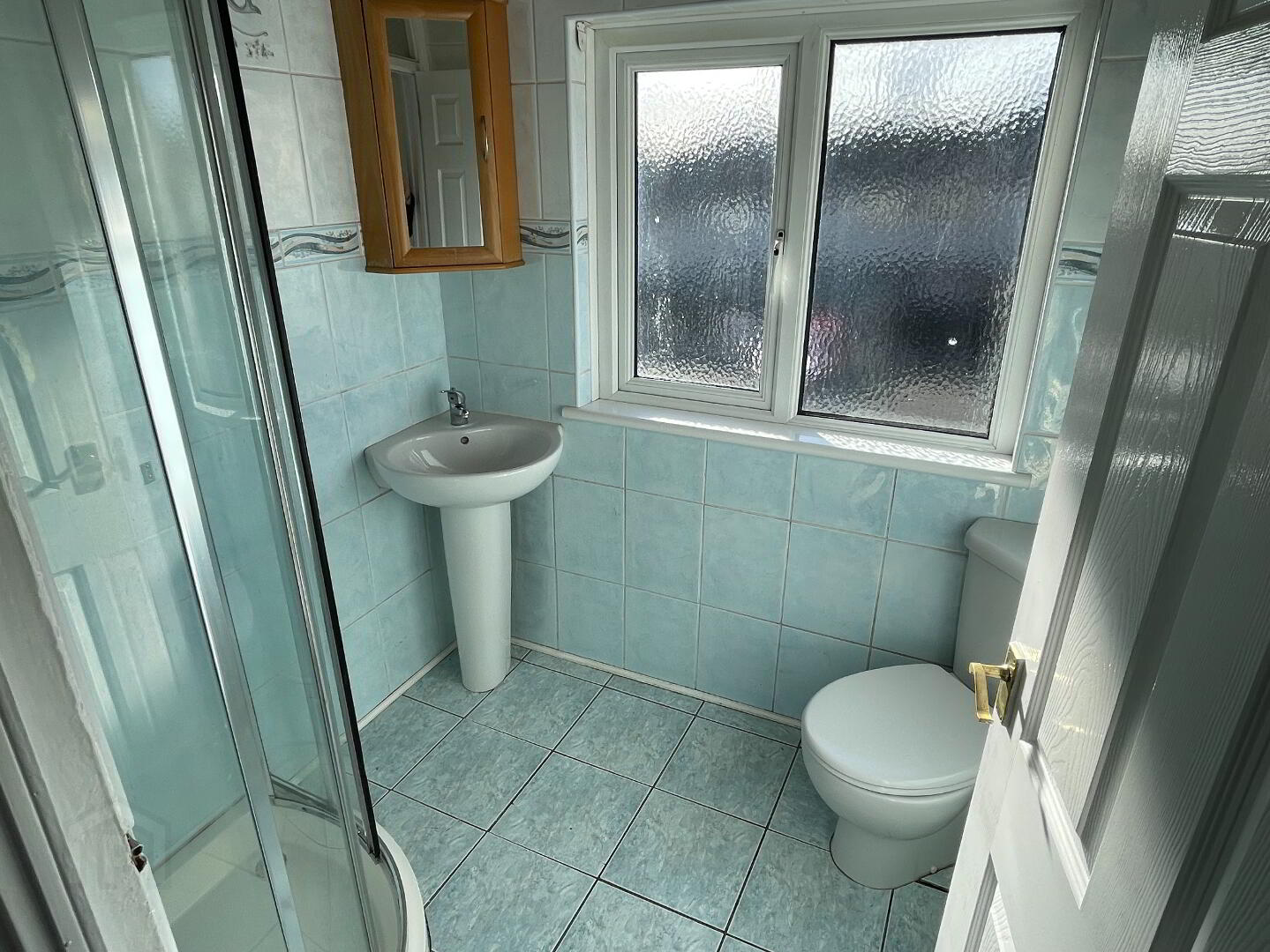 Centre light, extractor fan, tiled floor, fully wall tiled, white toilet and pedestal wash hand basin, walk-in corner Triton Alicante electric shower, towel radiator.