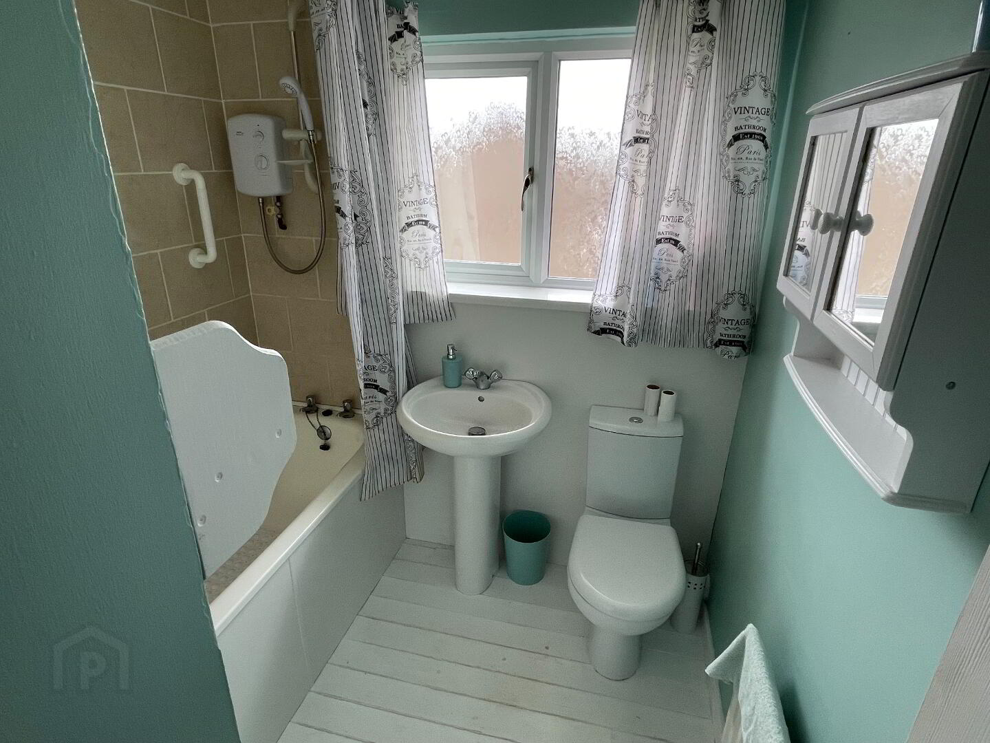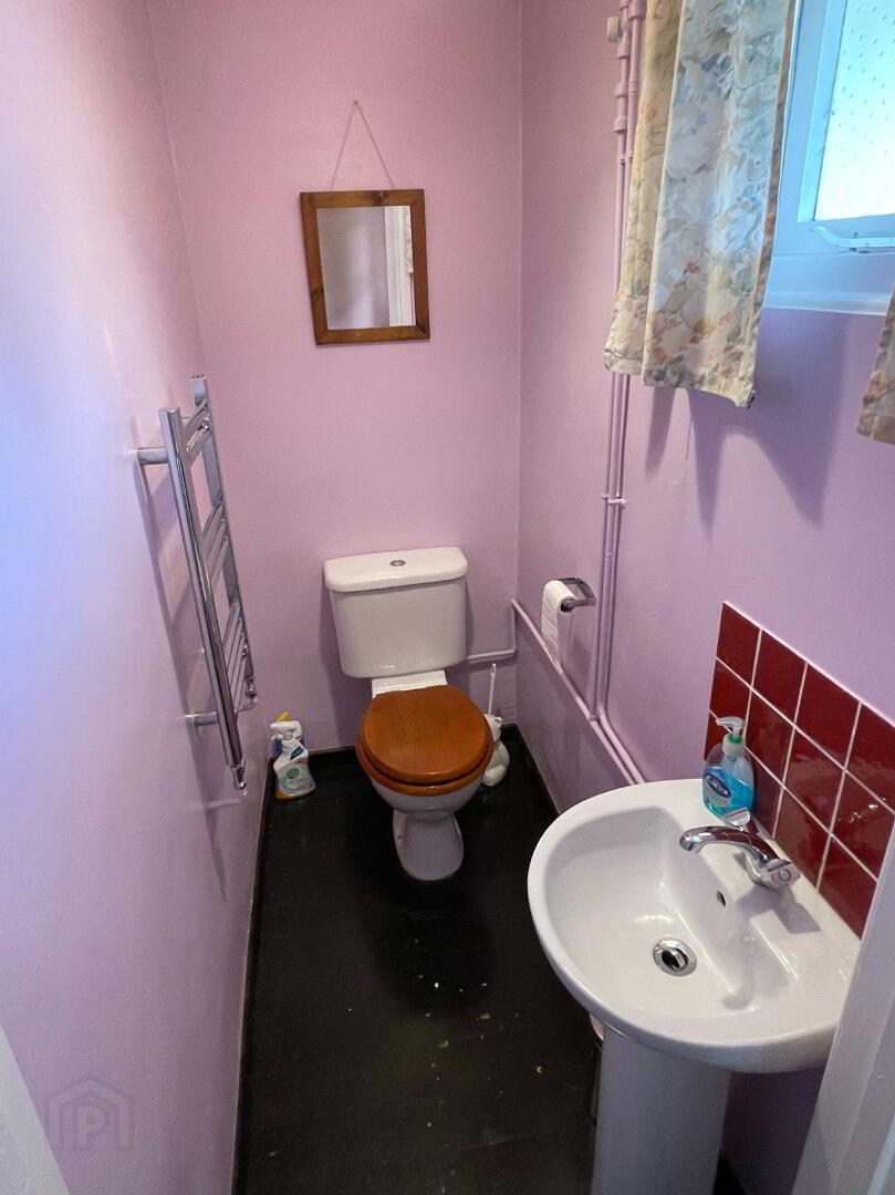 Centre light, painted solid pine wooden floor, partly wall tiled, white bathroom suite consisting of toilet, pedestal wash hand basin and bath with Triton electric shower over, single radiator.