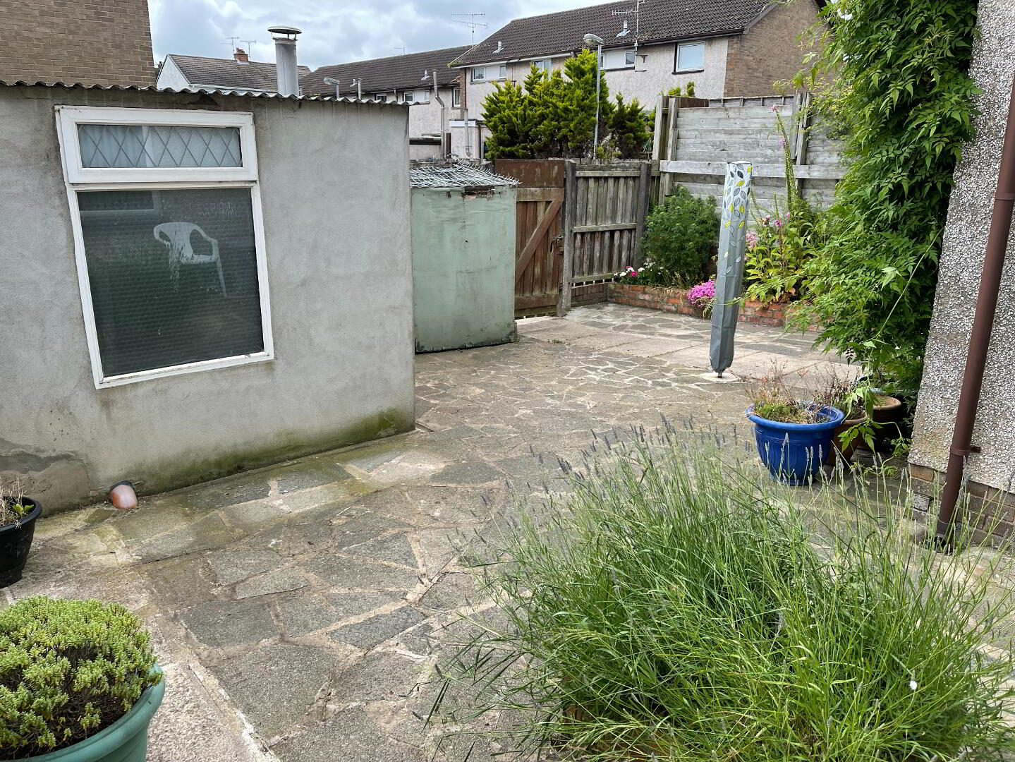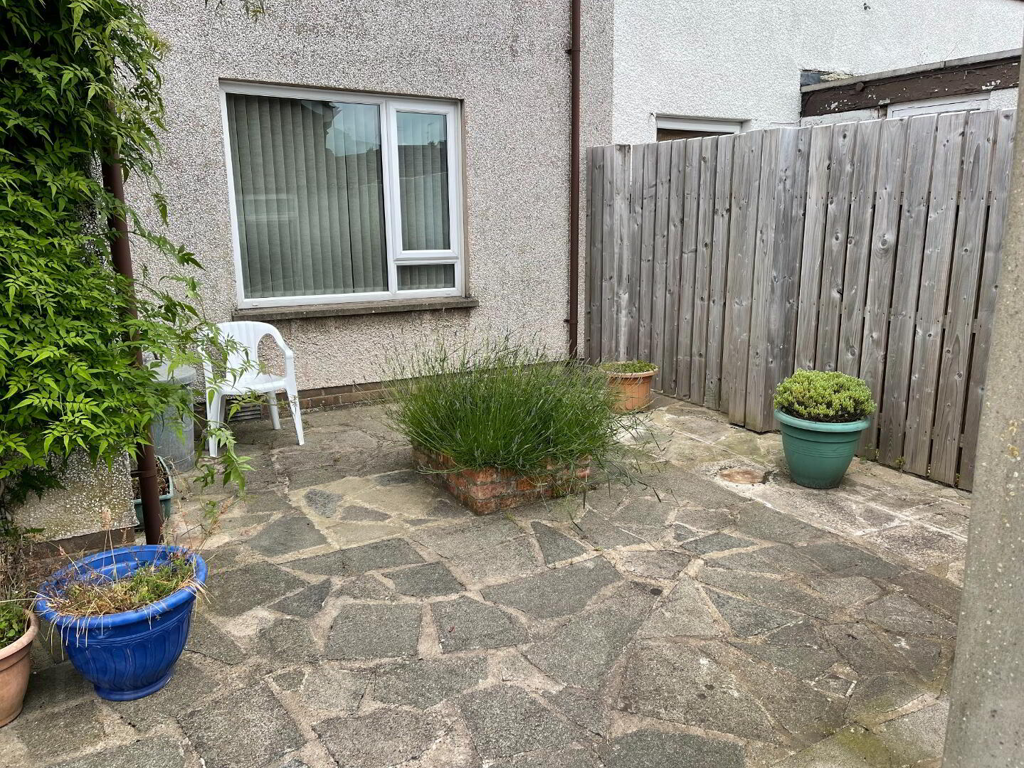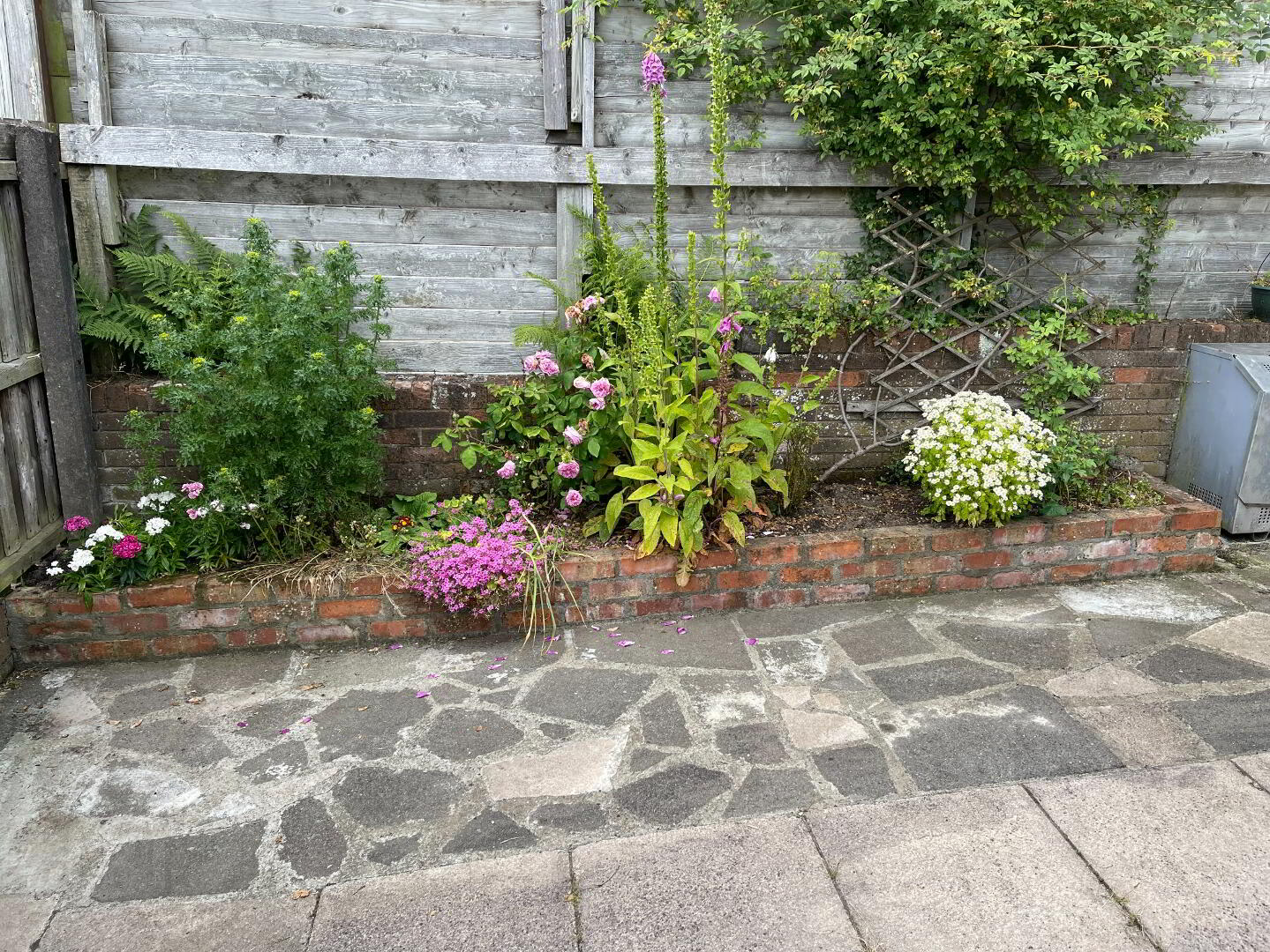 Enclosed paved rear yard with brick flower beds and rear gate, oil tank, outside tap.