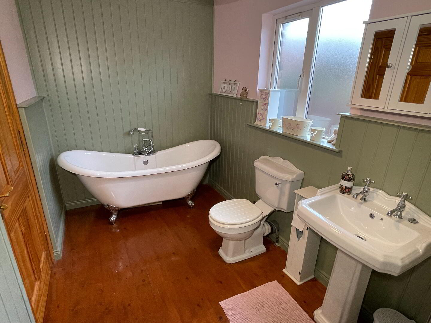 Centre light, extractor fan, solid wooden floor, part painted tongue and groove panelling to walls, white bathroom suite consisting of toilet, pedestal wash hand basin in vanity unit and freestanding bath with claw feet and telephone style mixer shower head, bathroom cabinet, walk-in shower pod, traditional towel radiator.