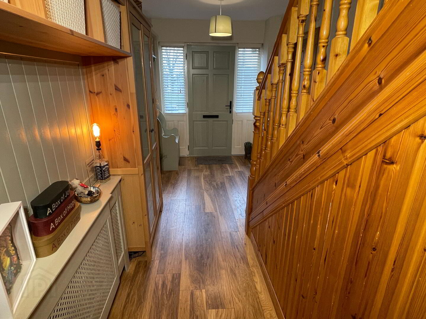 2 centre lights, laminate floor, built-in shelved storage units, single radiator with radiator cover, 1 single power point, understairs storage cupboard, wooden door with 2 glass panels to side.