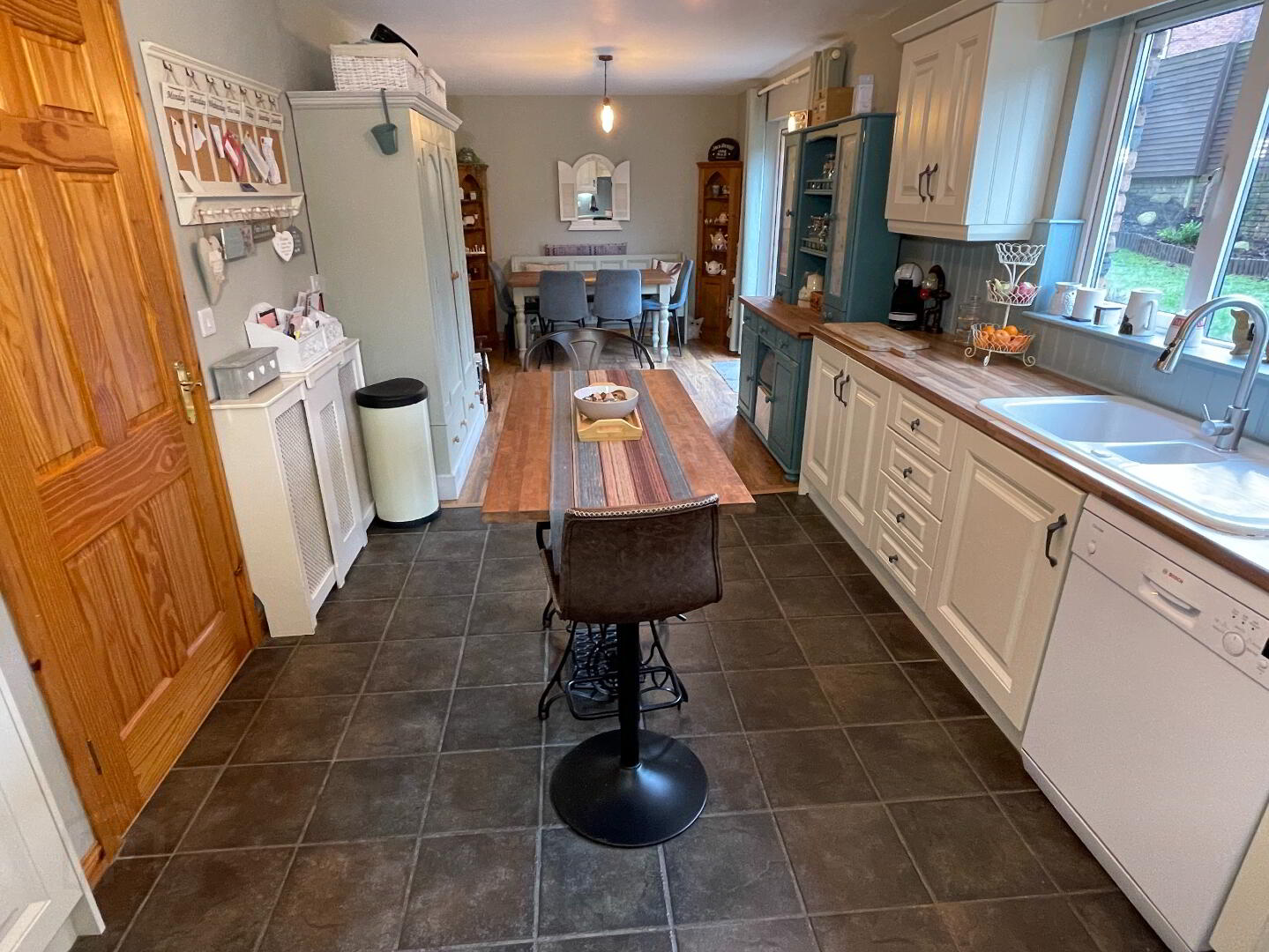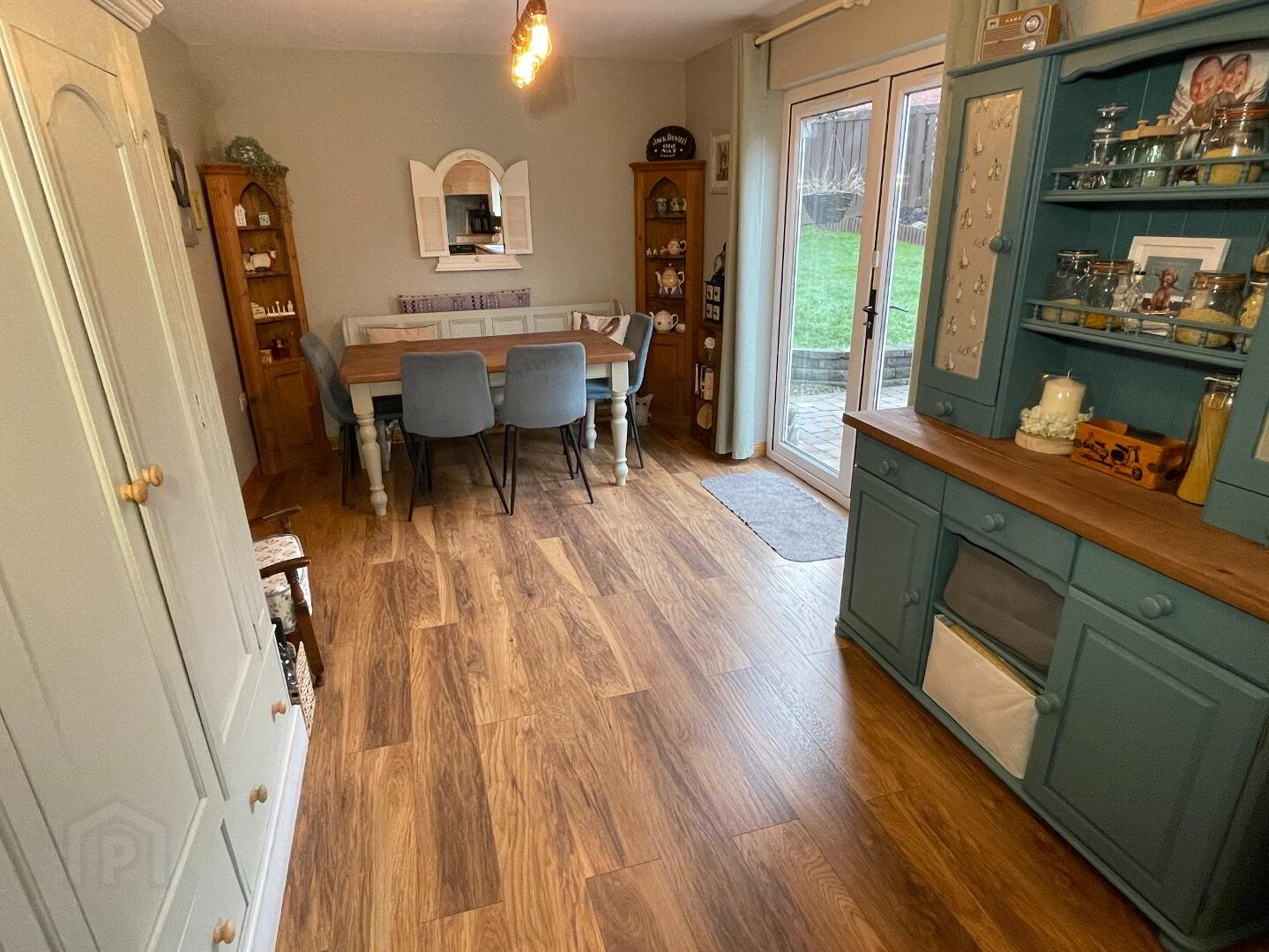 2 centre lights, tiled floor in the kitchen area, laminate floor in the dining area, 2 single radiators (one with radiator cover), part tongue and groove blue painted panelling to walls, cream high and low level kitchen units, unit lighting, porcelain sink, Bosh dishwasher, Belling electric cooker, integrated extractor fan, space for fridge freezer, 3 double power points, UPVC glazed French doors to patio area.
