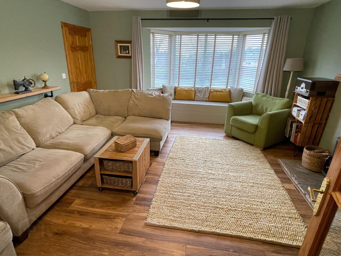 Centre light, laminate floor, double radiator, 3 double power points, TV point, Blacksmith multi-fuel stove (suitable for solid fuel), with stone hearth and antique pine overmantel, window seat, glazed French doors to dining area.