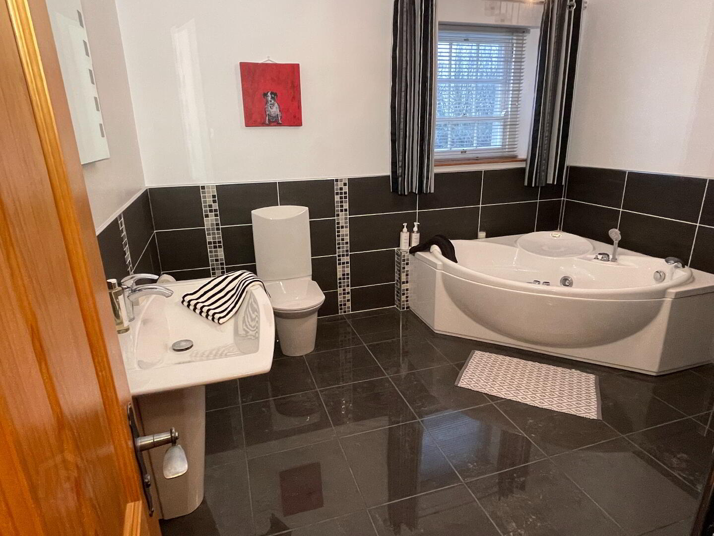 Centre light, extractor fan, thermostat, tiled floor (underfloor heating), partly wall tiled, white bathroom suite consisting of Laufen wash hand basin and toilet, Jacuzzi corner bath, walk-in shower, towel radiator, shaving point.