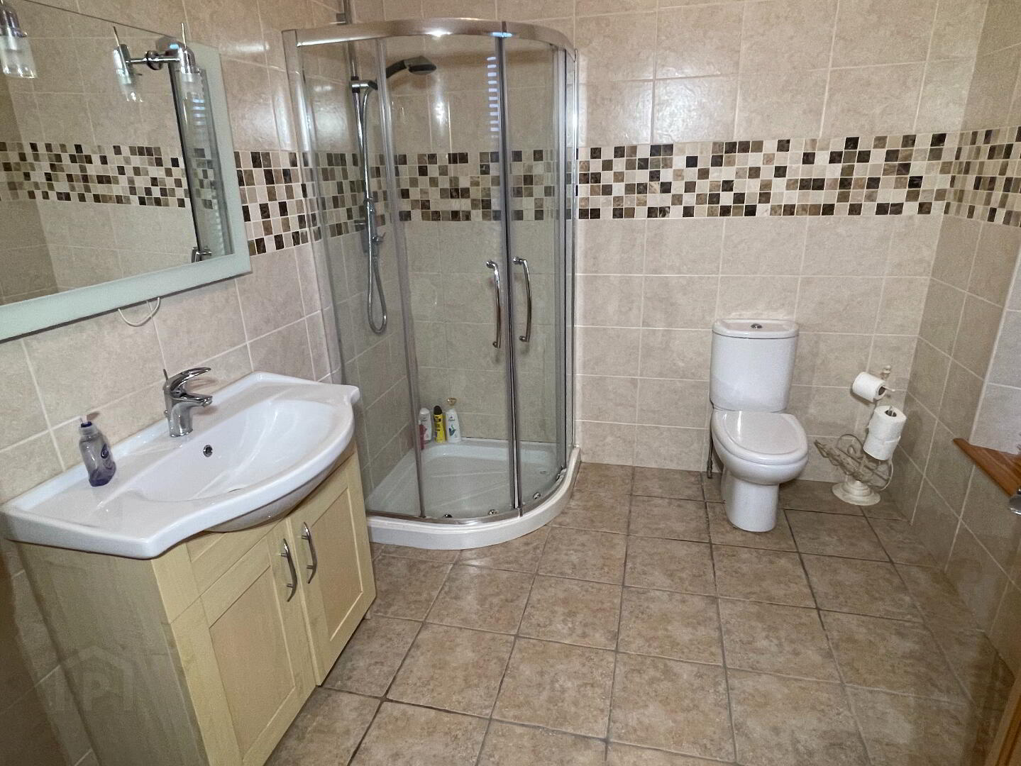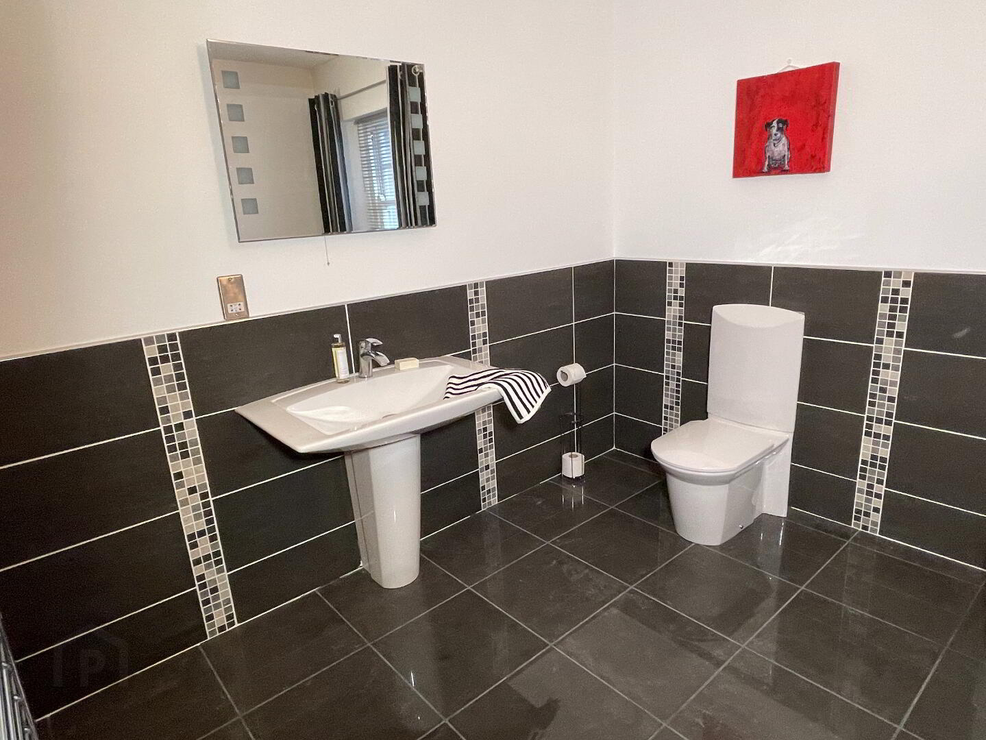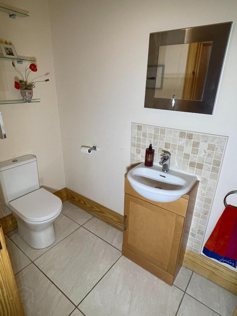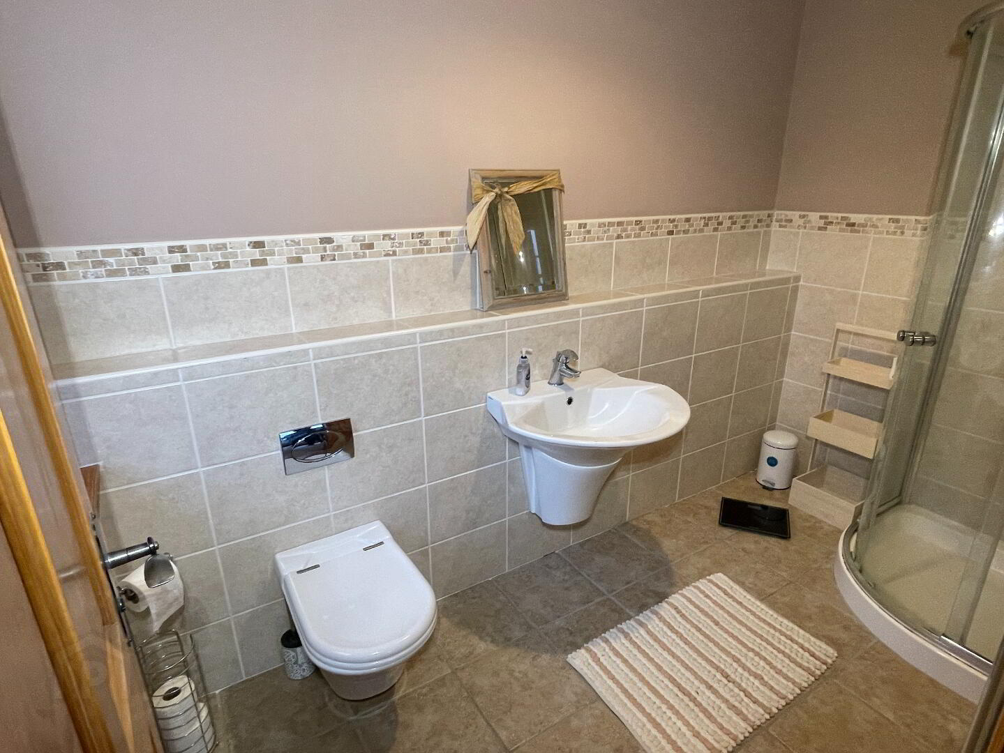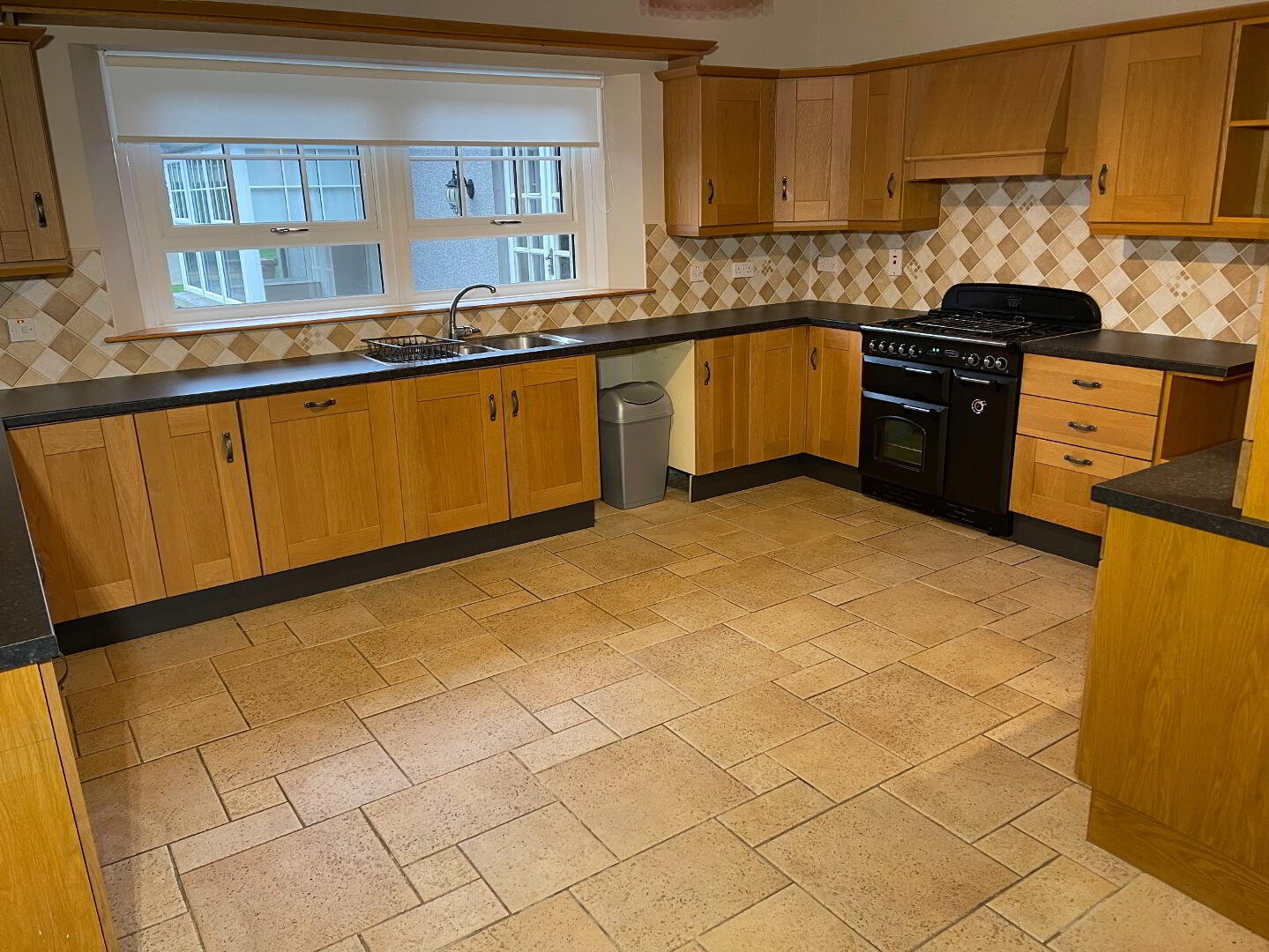 Centre light, extractor fan, thermostat, tiled floor (underfloor heating), partly wall tiled, 2 double power points, beech style high and low level storage units, plumbed for washing machine, space for tumble dryer, Grant condensing oil burner, central heating control.