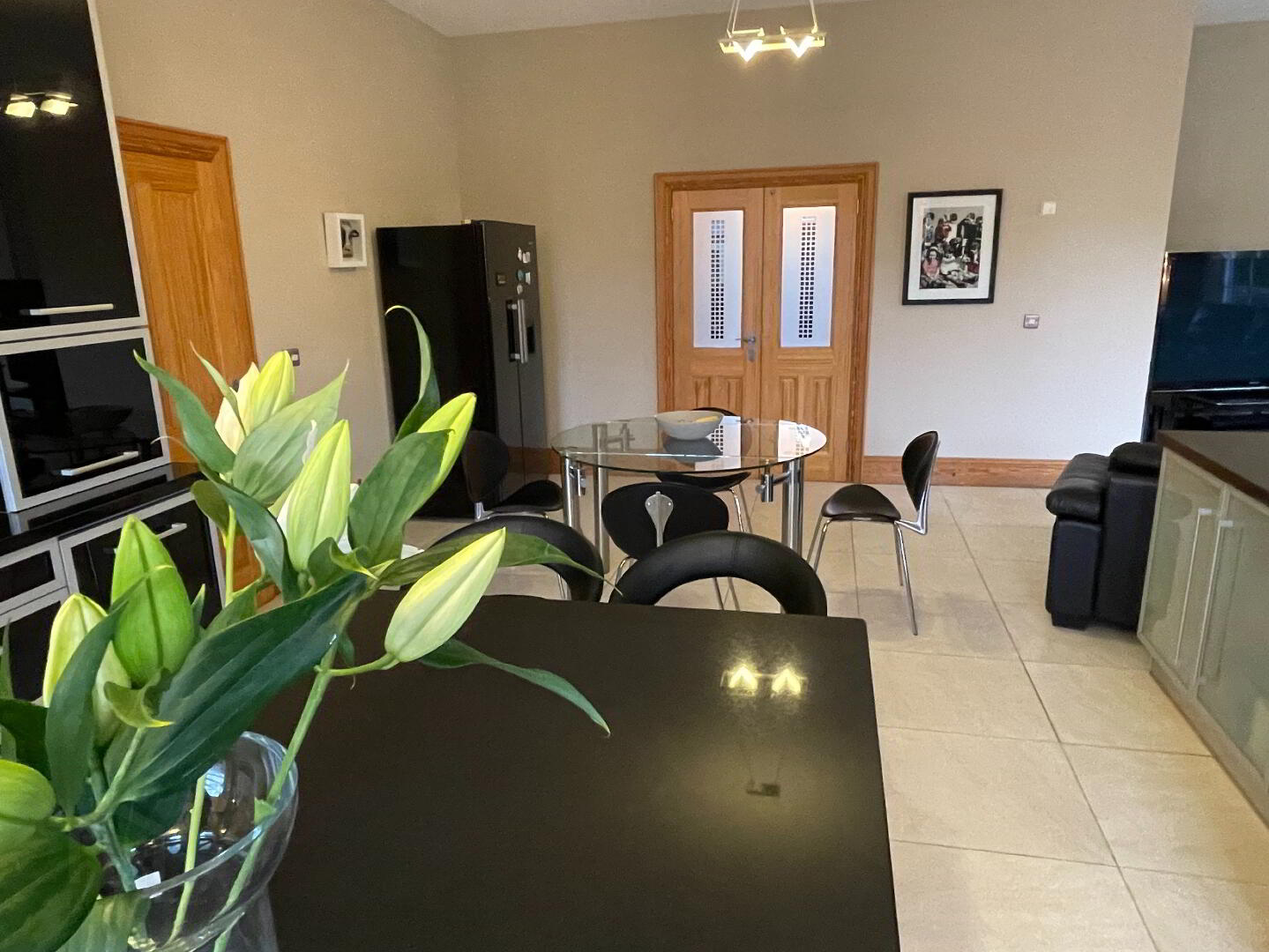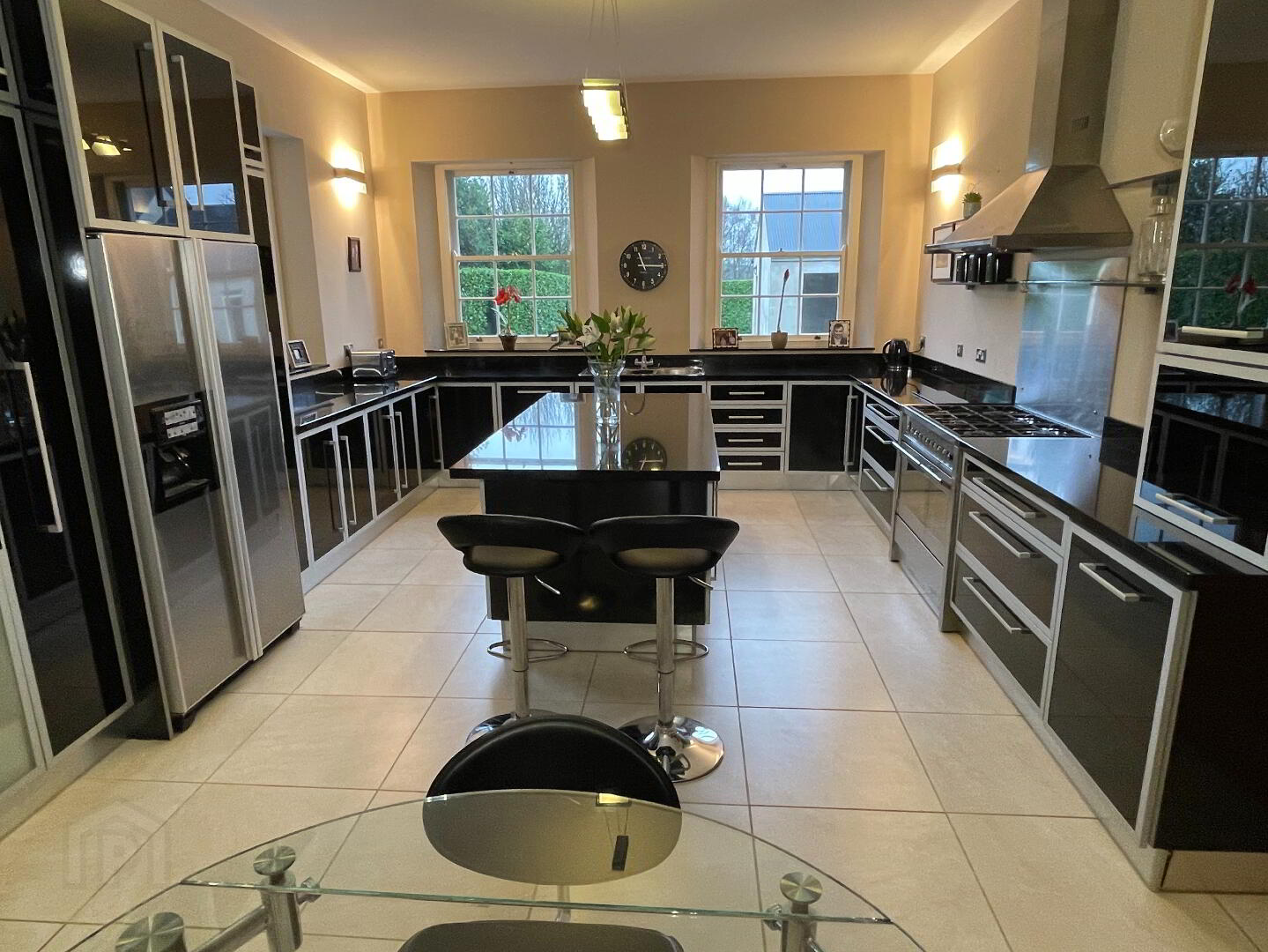 2 centre lights, 2 wall lights, thermostat, tiled floor (underfloor heating), 6 double power points, TV point, telephone point, black high gloss high and low level kitchen units and central island with seating area, 4 glass wall shelves, Smeg stainless steel dual fuel cooker with stainless steel splashback, Smeg stainless steel extractor fan, Franke stainless steel sink, Beko integrated dishwasher, space for American fridge freezer.