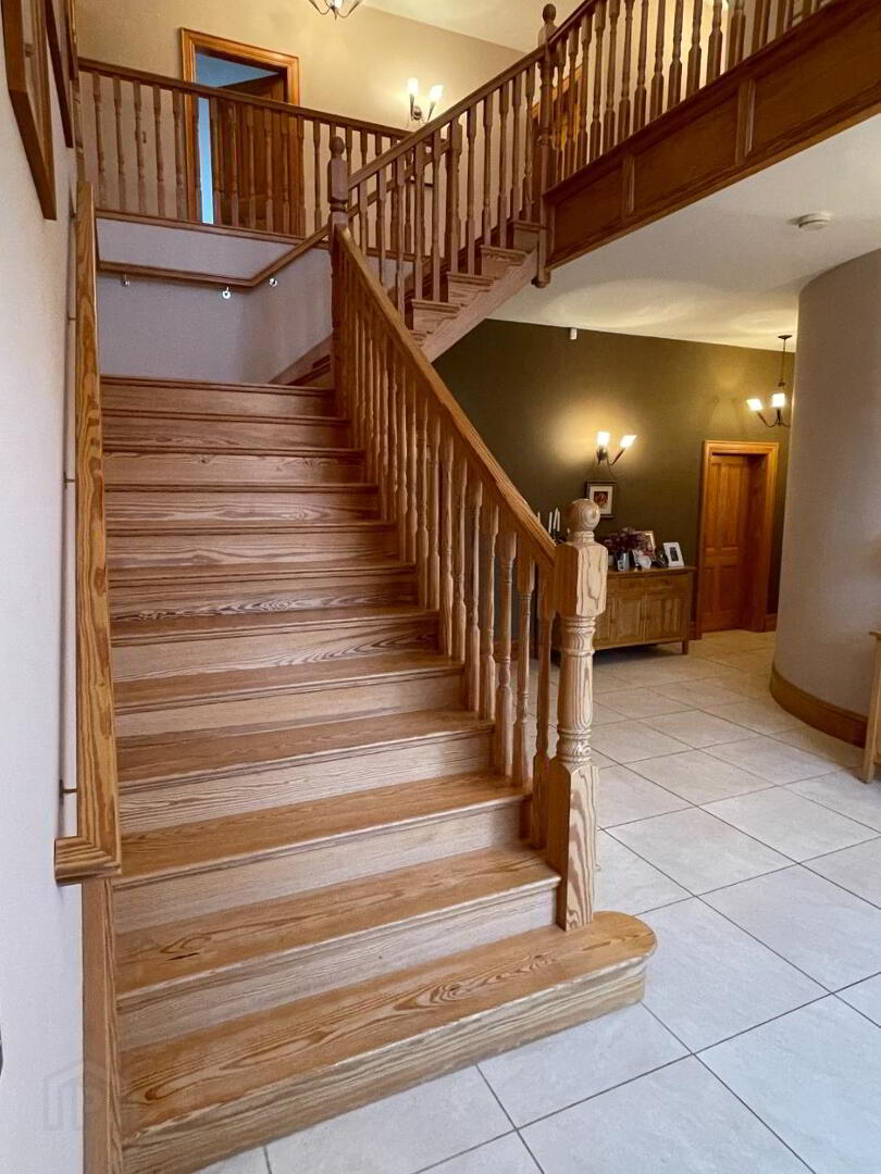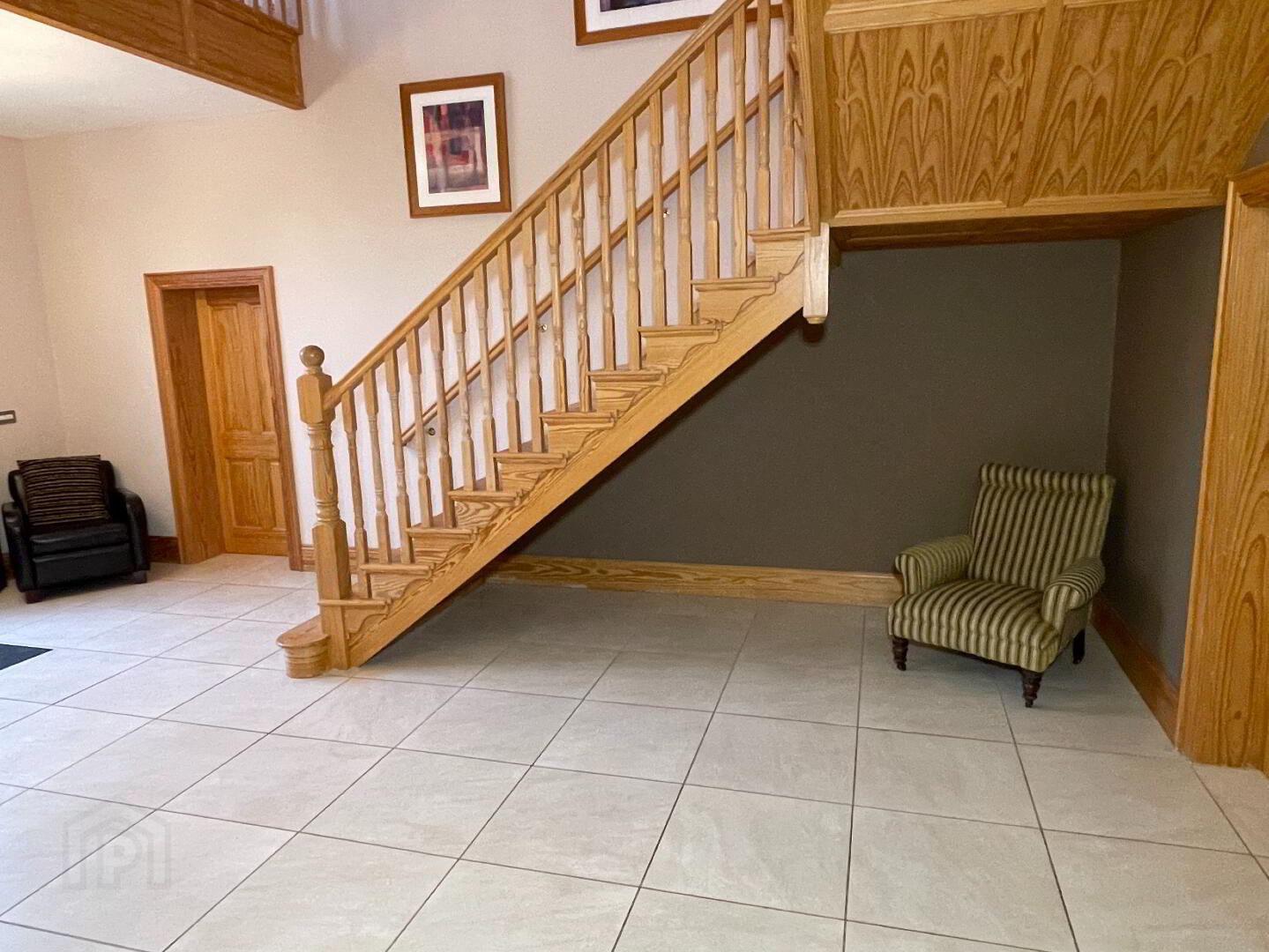 2 centre lights, 3 wall lights, curved feature wall, telephone point, 2 double power points, thermostat, tiled floor (underfloor heating), Georgian style wooden entrance door, pitch pine staircase.