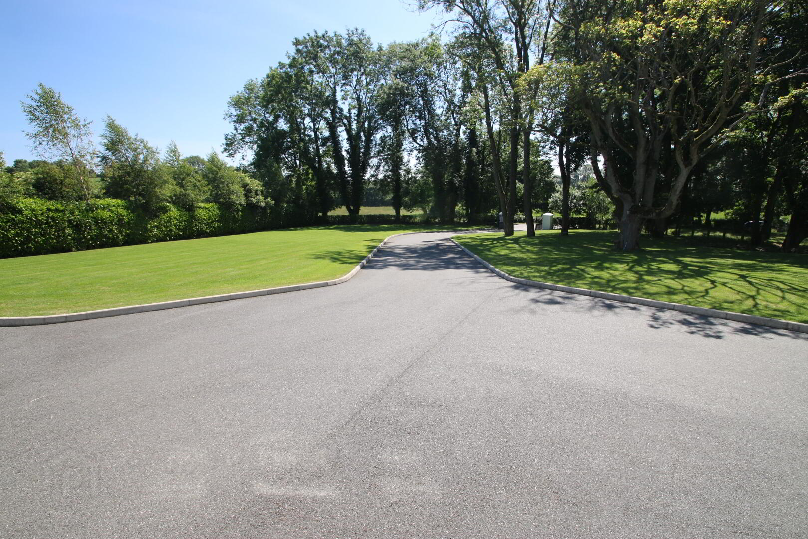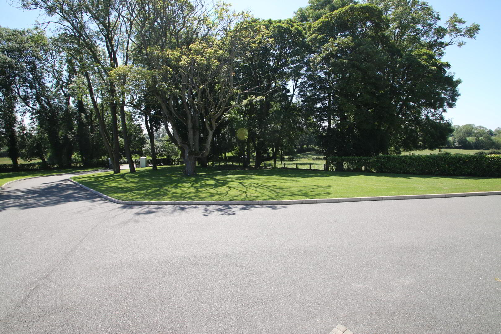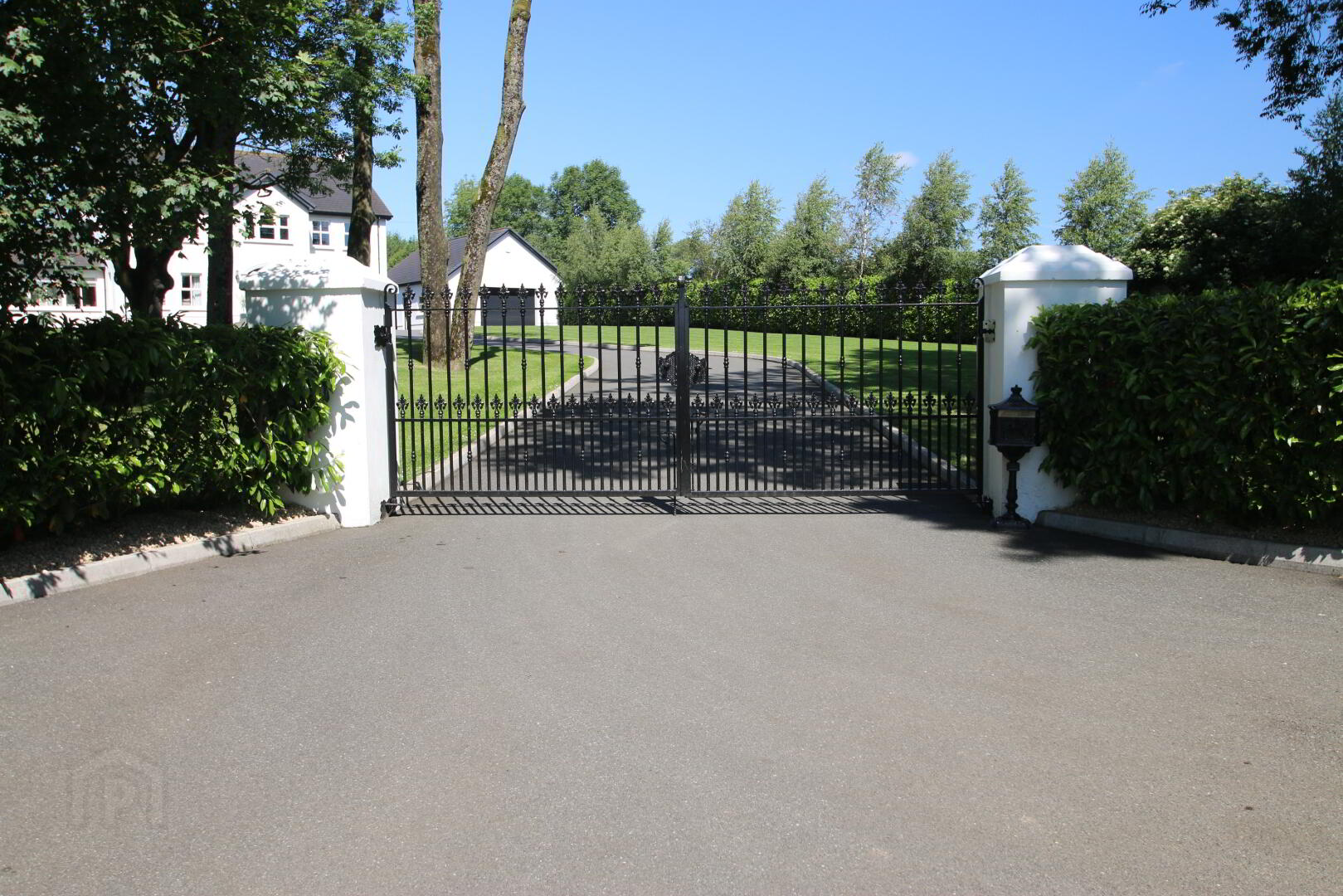 Entrance pillars with steel gates, tarred drive with kerbs, mature trees, lawn.