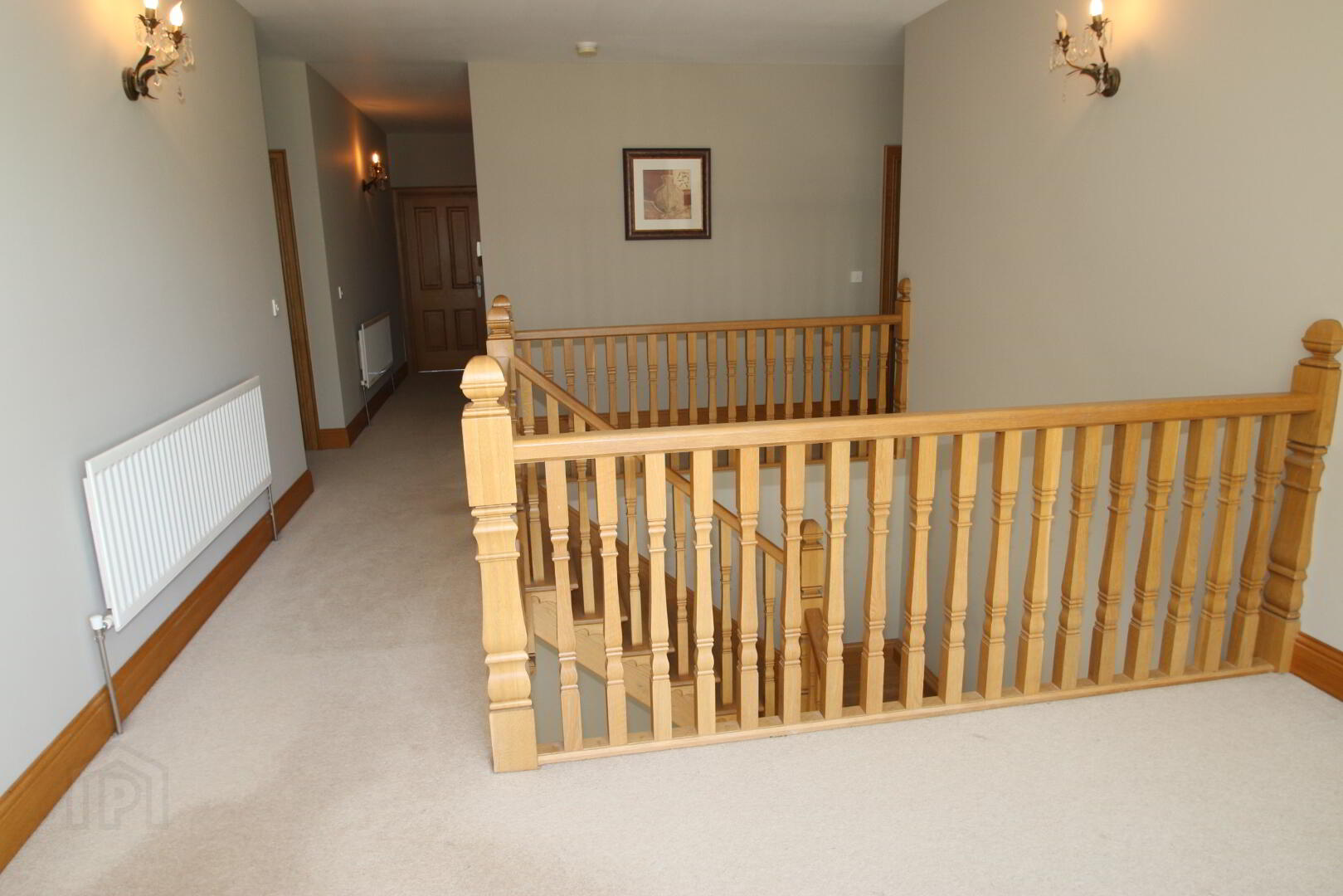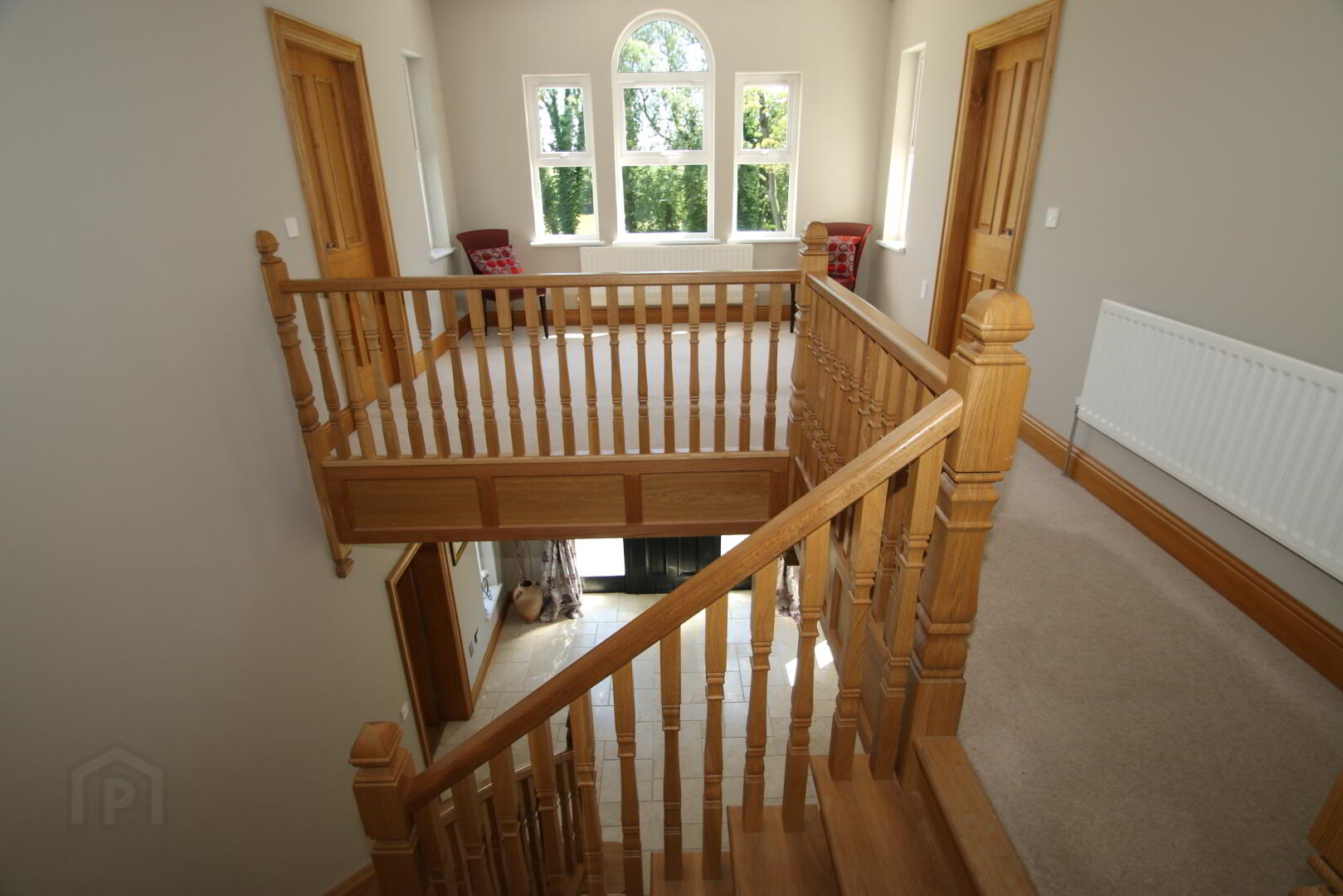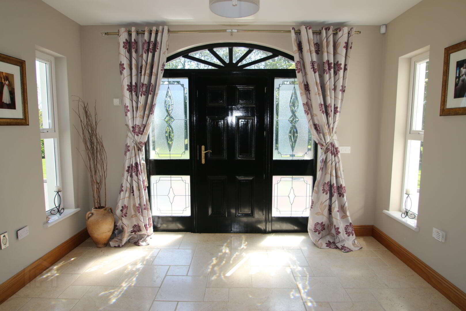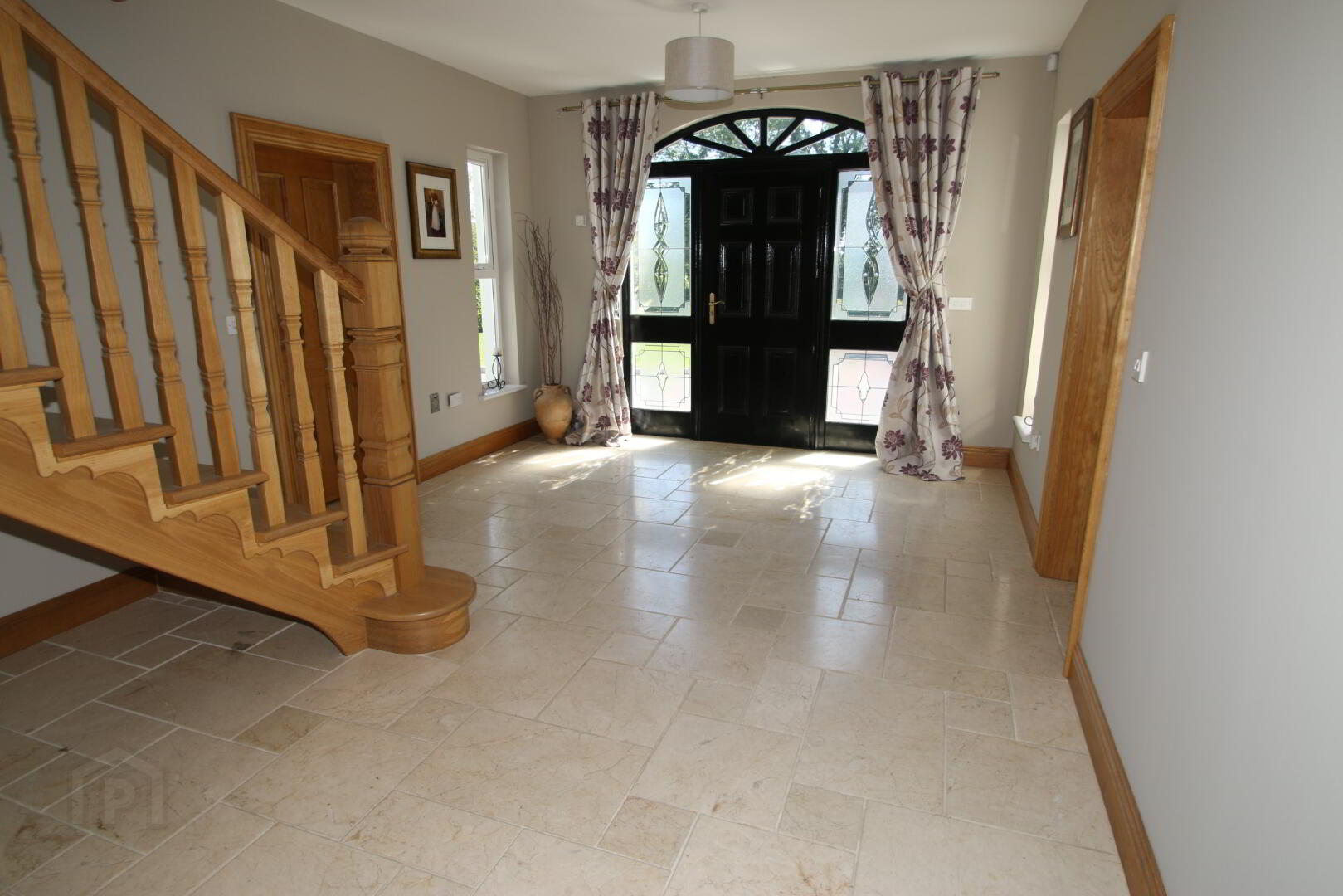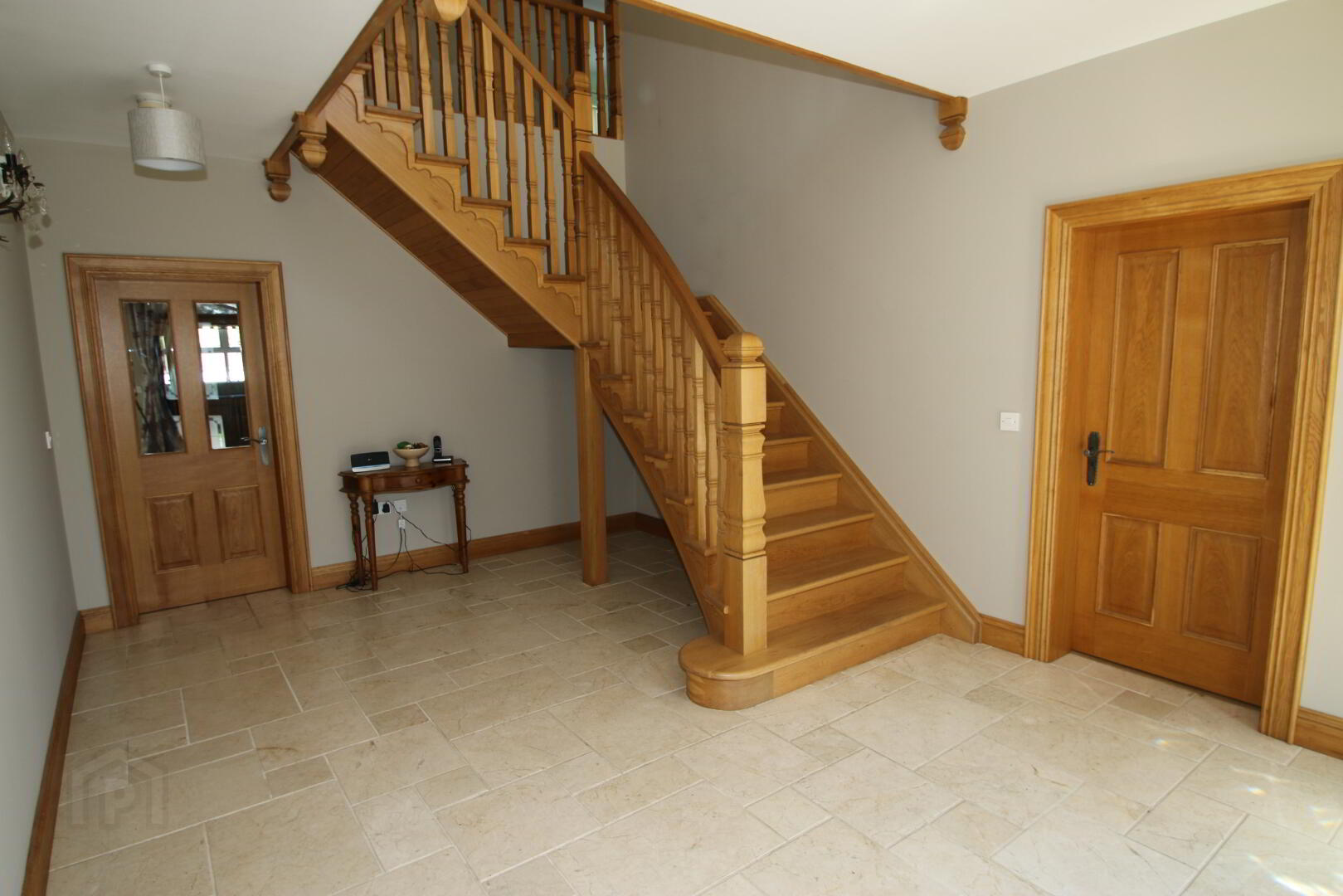 2 centre lights, wall light, marble floor, oak feature staircase, 3 double power points, thermostat, telephone point, Hardwood front door with 4 decorative glazed panels with fan light above, beam vacuum point, underfloor heating.