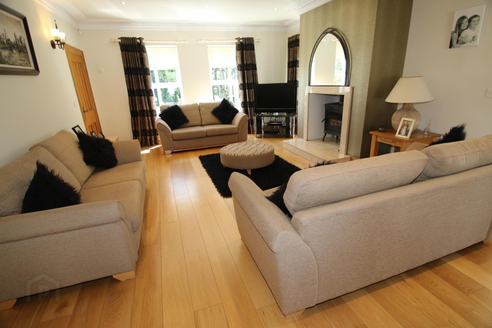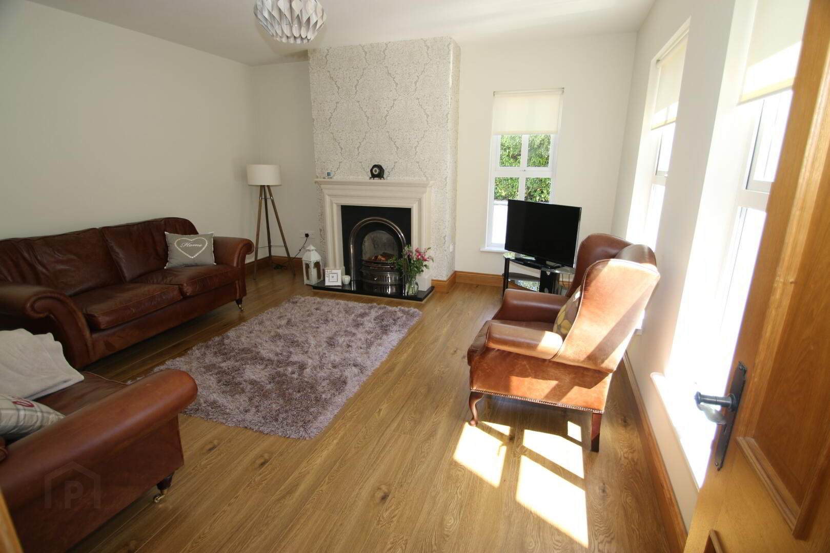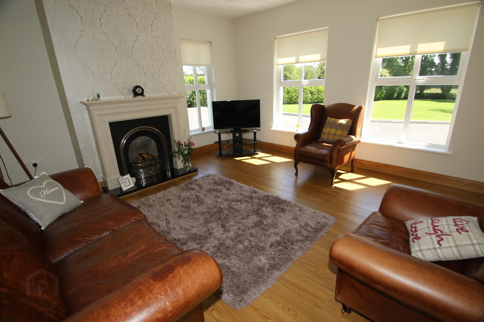 Centre light, 3 double power points, 3 lamp 5 Amp points, TV point, oak style flooring, limestone fireplace with cast iron style insert and granite hearth (suitable for solid fuel), underfloor heating.
