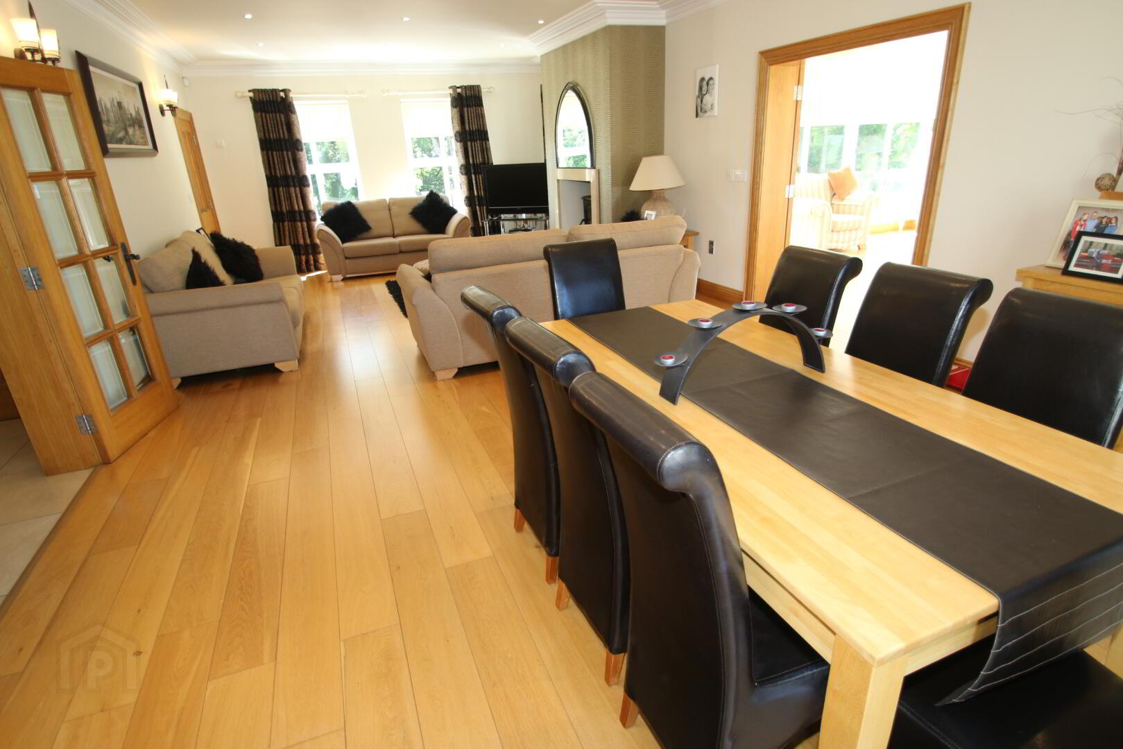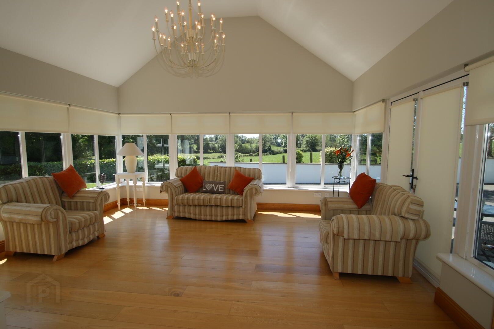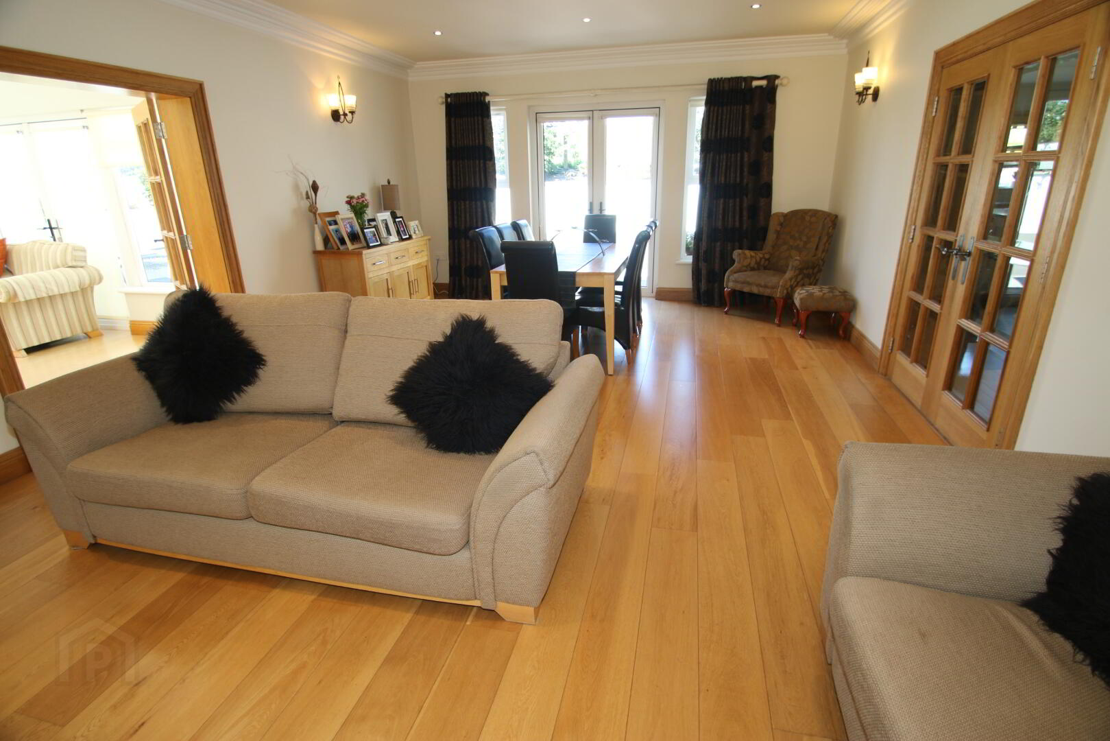 Centre light, vaulted ceiling, engineered oak flooring, 3 double power points, 2 lamp 5 Amp power points, glazed French doors to patio area, glazed oak doors to dining area, underfloor heating.
