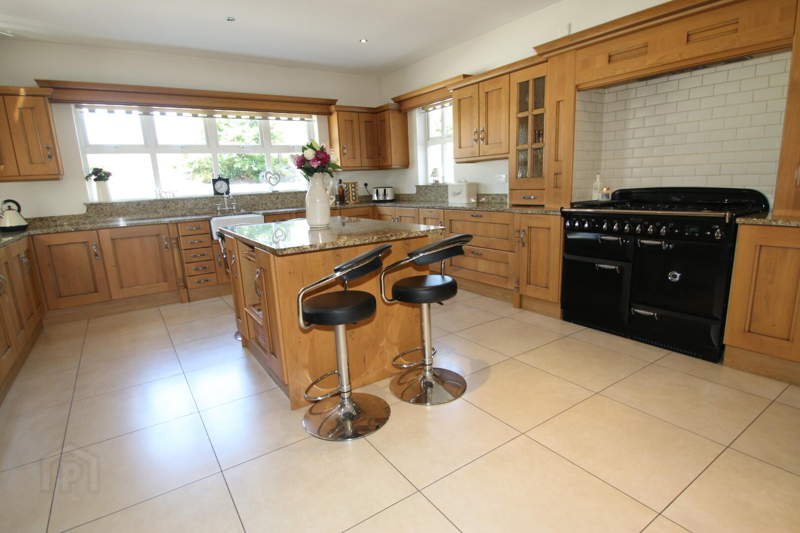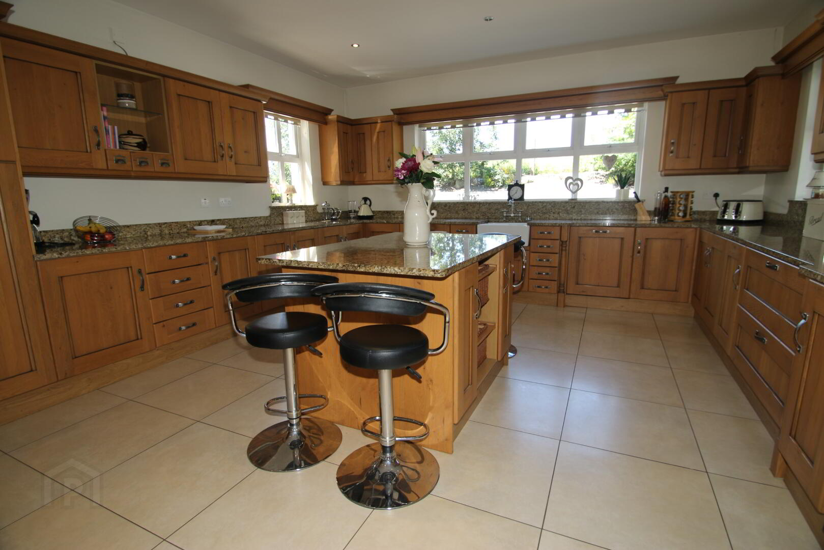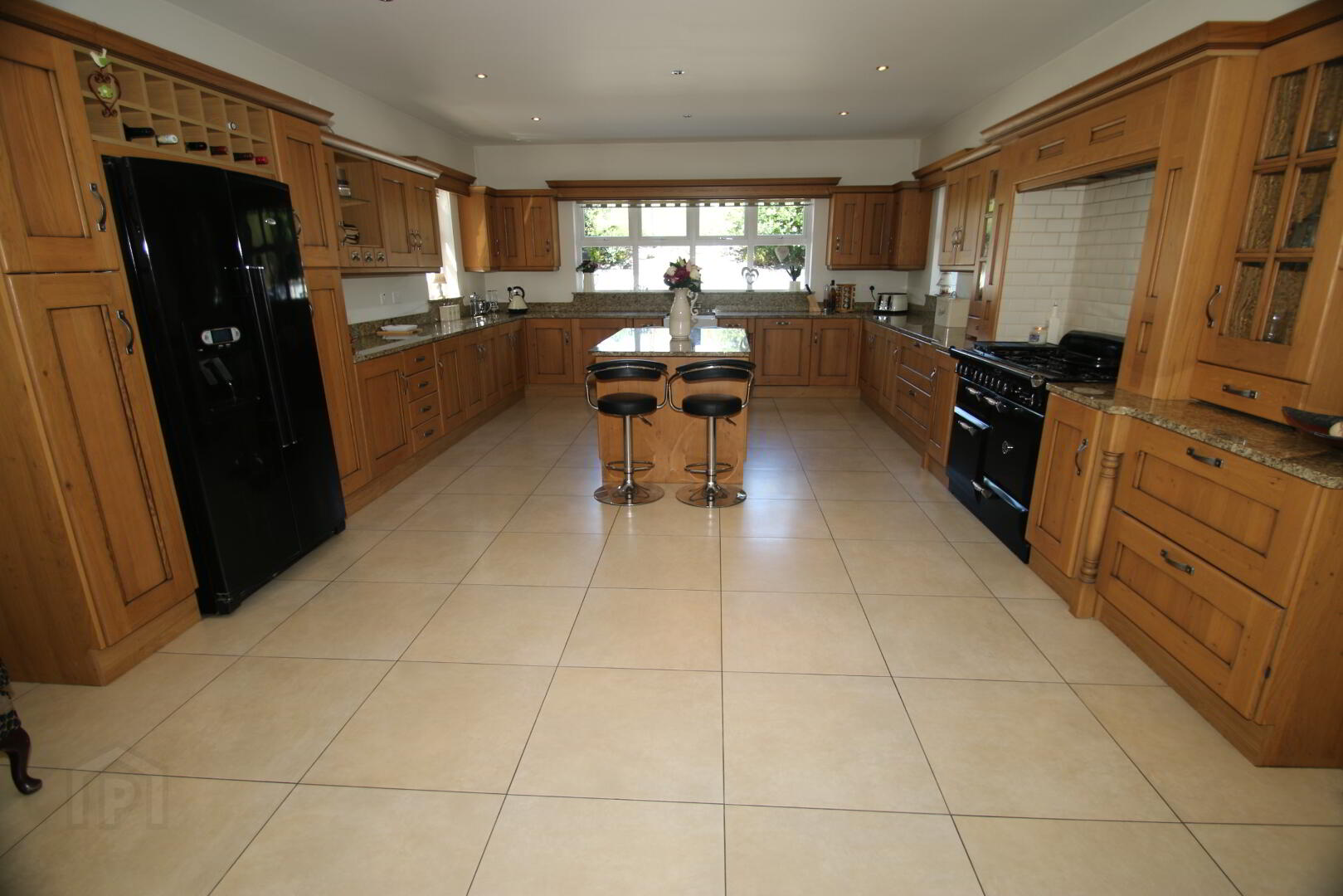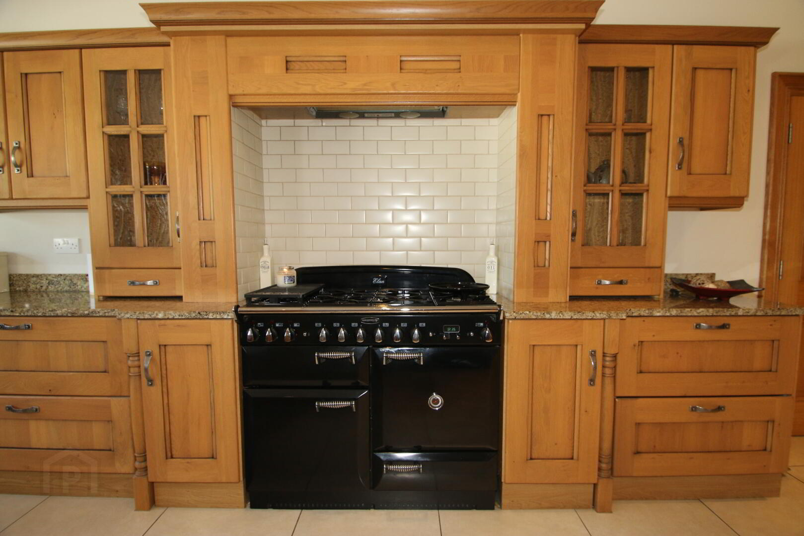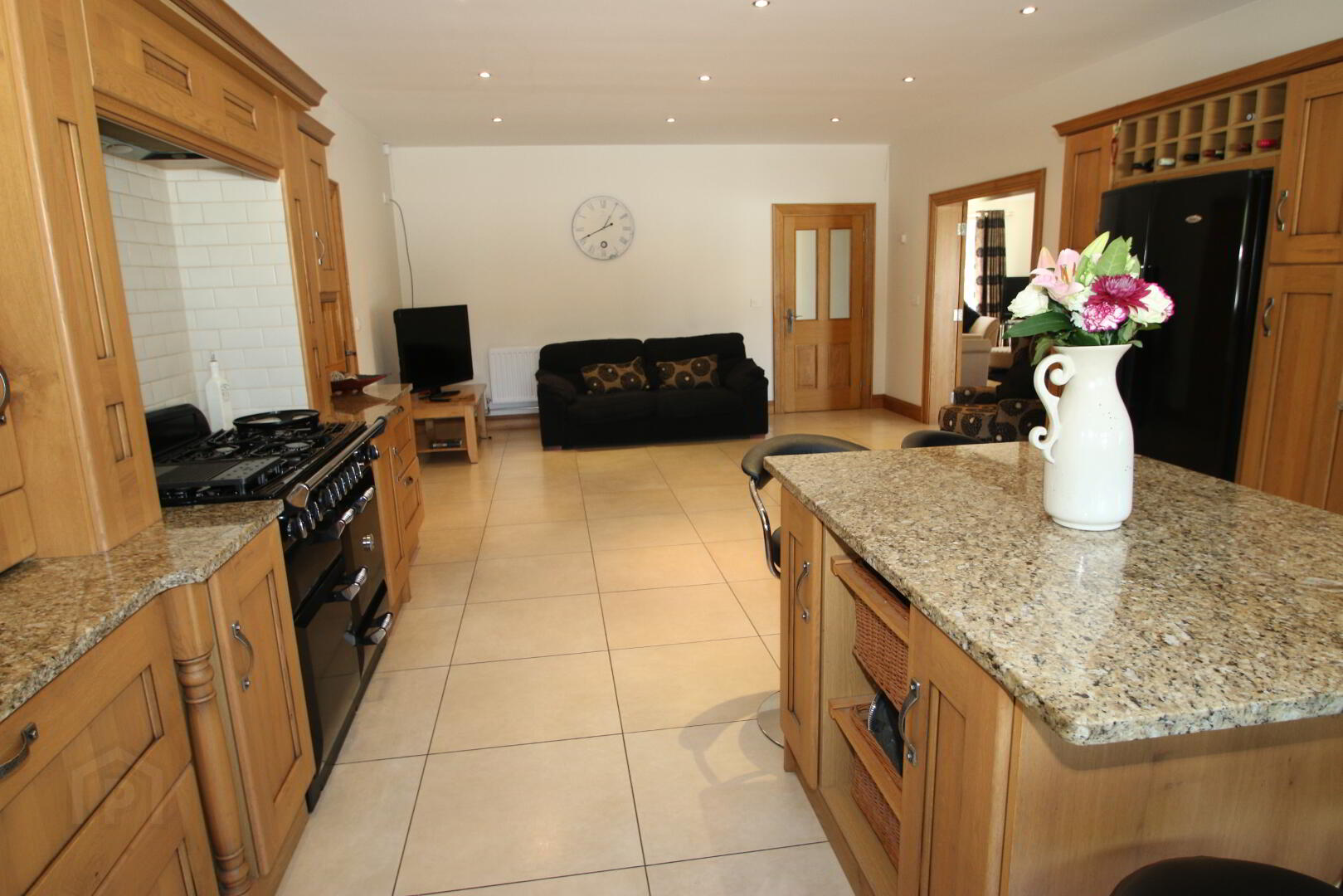 Recessed lighting, high and low level Croft oak kitchen units, 2 glass display units, spice drawers, wine rack, Belfast sink, integrated Beko dish washer, Whirlpool American fridge freezer, Rangemaster Elan dual fuel cooker, integrated extractor fan, 7 double power points, TV point, granite worktops, moveable centre island with eating area and wicker baskets.