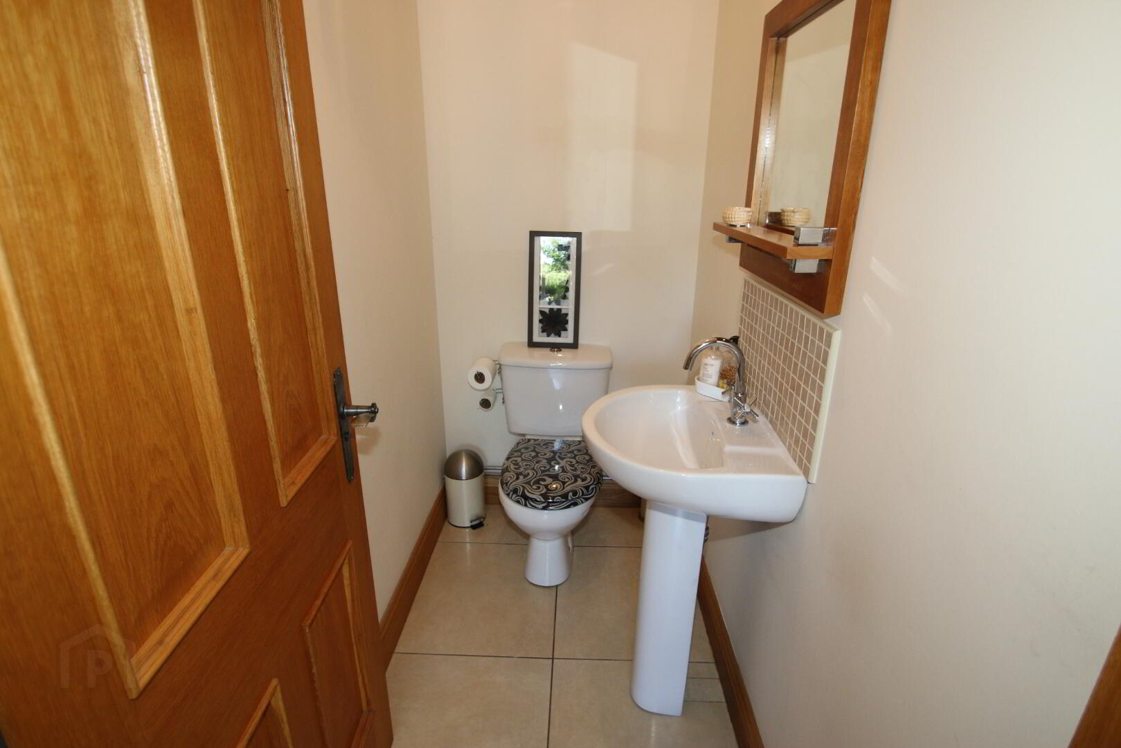 Centre light, extractor fan, white toilet, pedestal wash hand basin, tiled floor, tiled above sink.