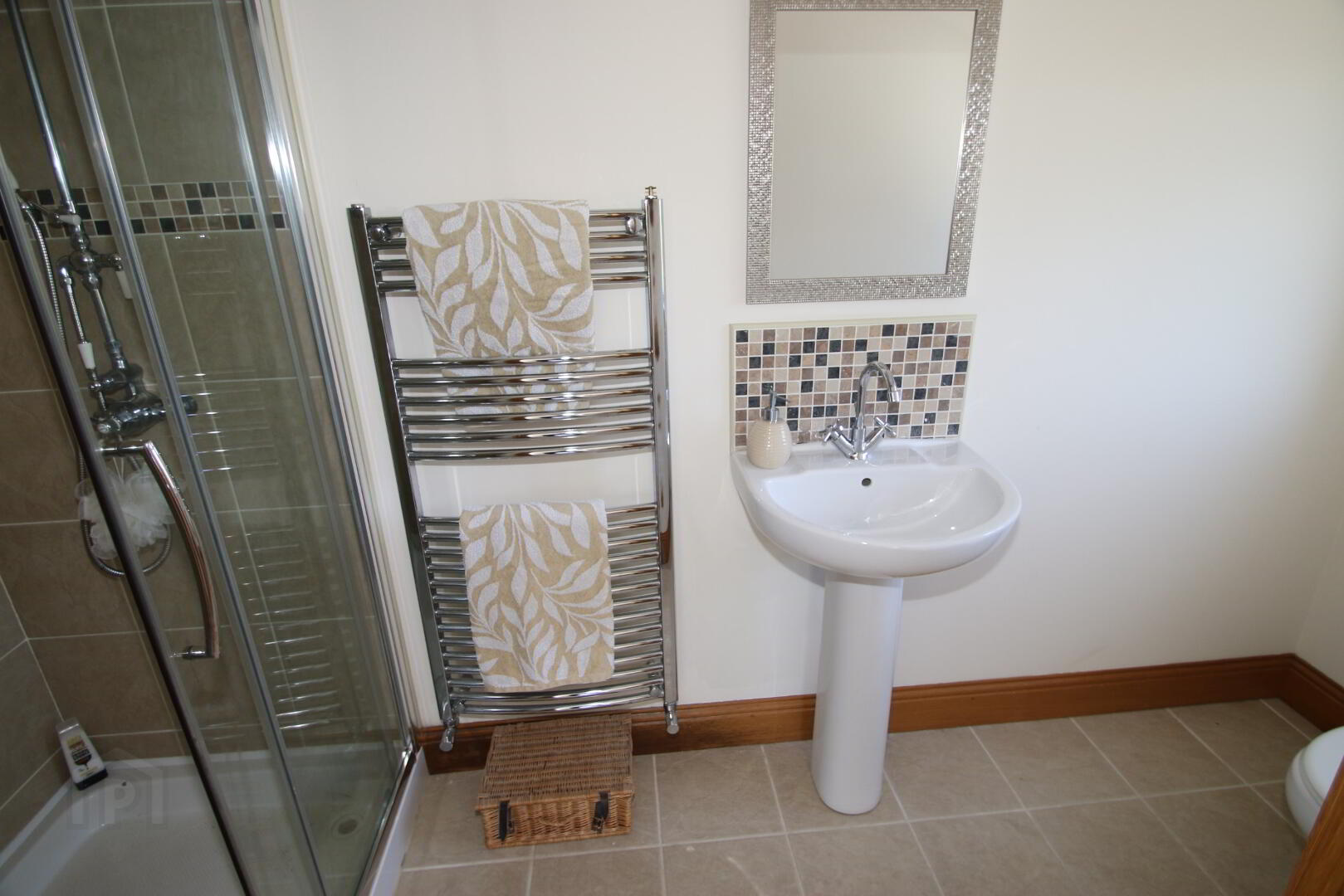 Centre light, extractor fan, tiled floor, partly wall tiled, towel radiator, white toilet and pedestal wash hand basin, walk-in rain type shower.