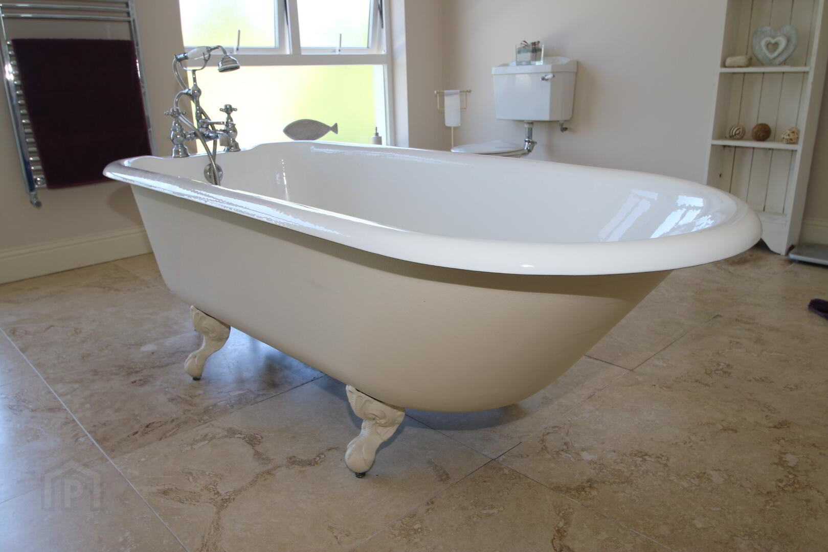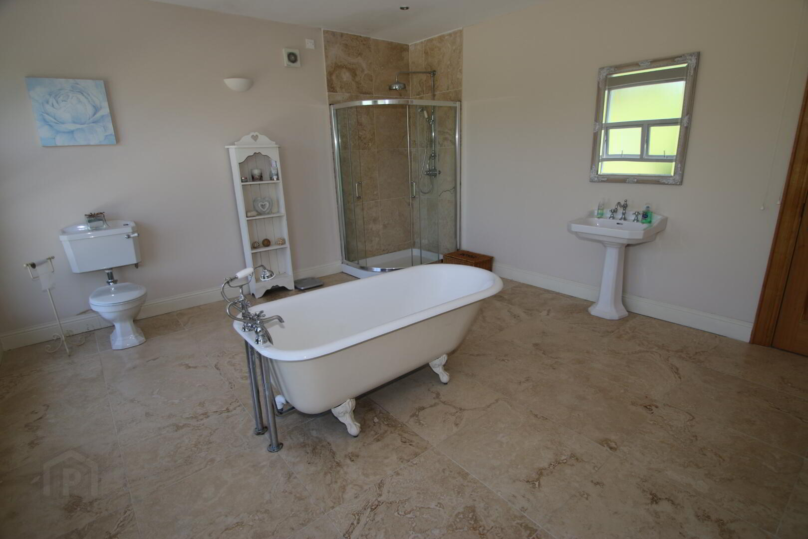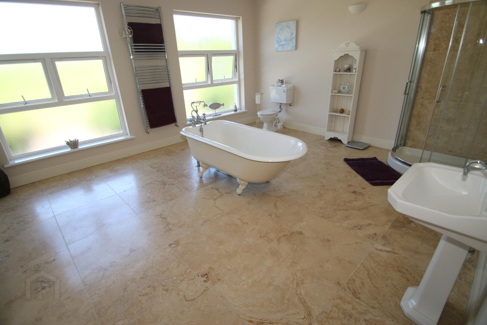 Recessed lighting, white bathroom, suite consisting of toilet, pedestal wash hand basin, feature bath with claw feet and telephone style mixer tap shower head, walk-in rain style shower, limestone floor tiles, partly wall tiled in limestone, extractor fan, double radiator, 2 wall lights, towel radiator.