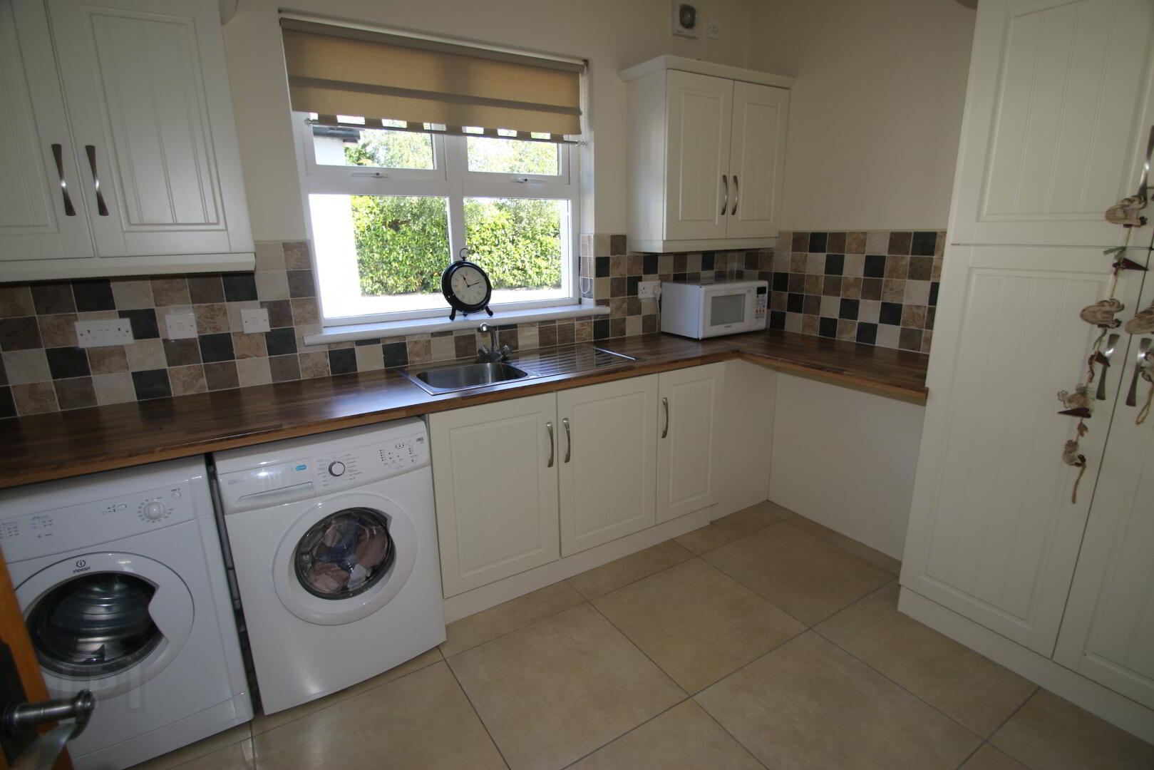 Centre light, extractor fan, high and low level cream units, stainless steel sink, tiled floor, partly wall tiled, 2 double power points, thermostat, underfloor heating, central heating control, plumbed for washing machine, space for tumble dryer.