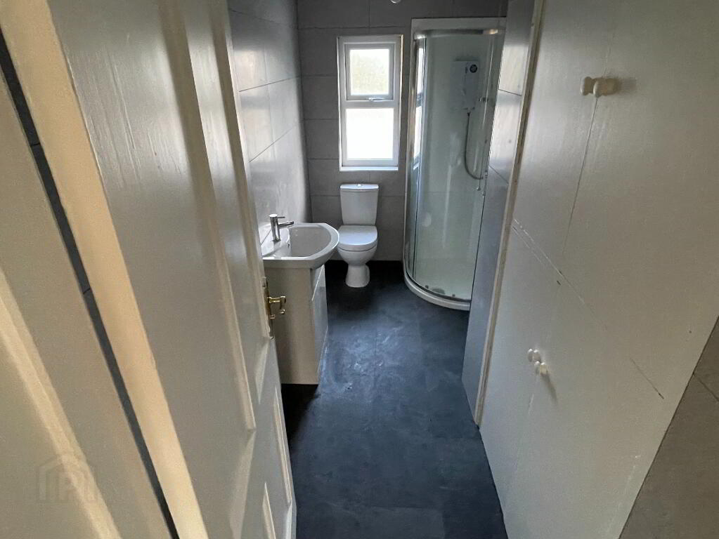Centre light, white toilet and wash hand basin in vanity unit, shower pod with Mira Sport electric shower, laminate floor, fully wall tiled, double radiator.