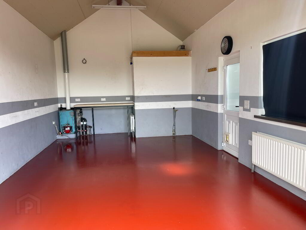Fluorescent lighting, 2 double radiators, Grant oil burner, 1 single power point, 7 double power points, water tap, built-in work bench, electric insulated roller door, UPVC half glazed door, window, generator point, roof height suitable for car lift.