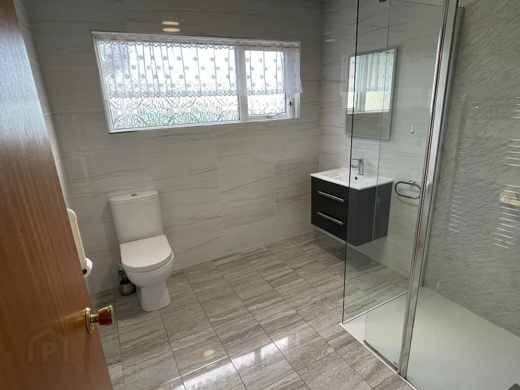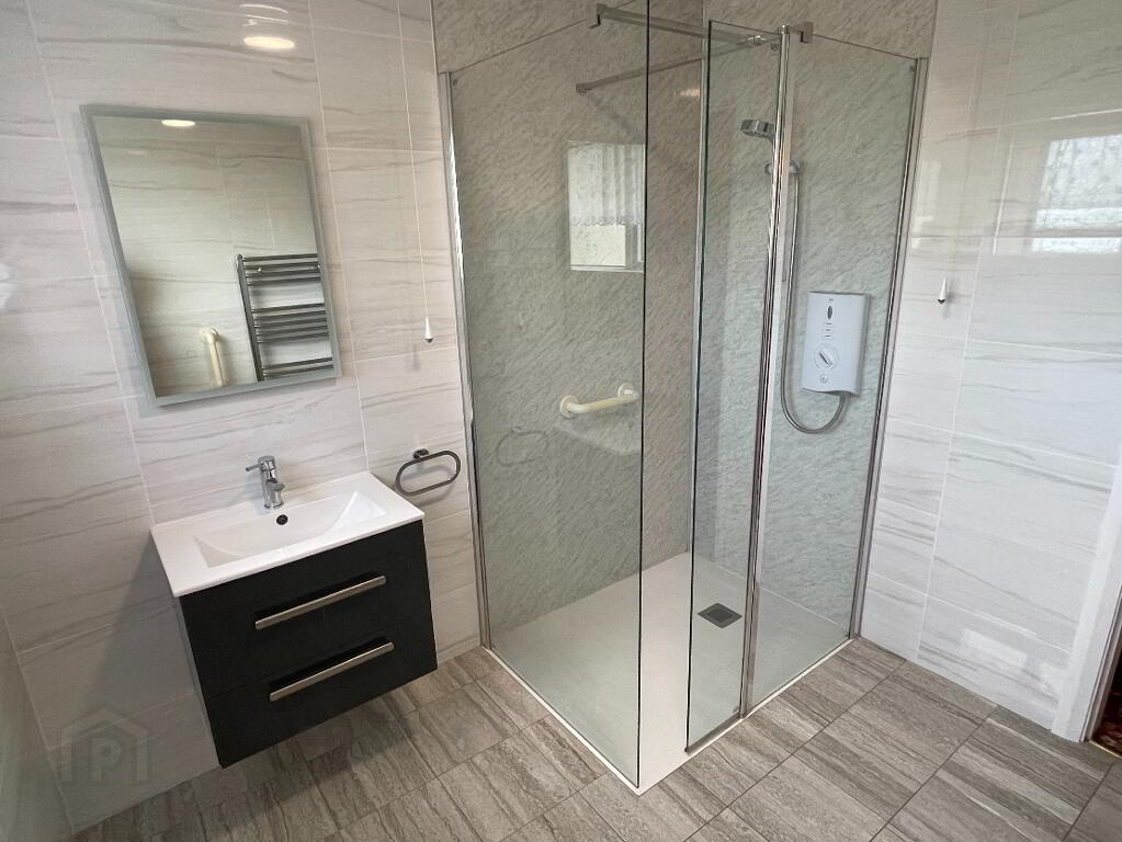 Centre light, extractor fan, UPVC panelling to ceiling, tiled floor, fully wall tiled, Mira Sport electric shower with UPVC panelling to walls, white toilet and wash hand basin in vanity unit, LED wall mirror, towel radiator.