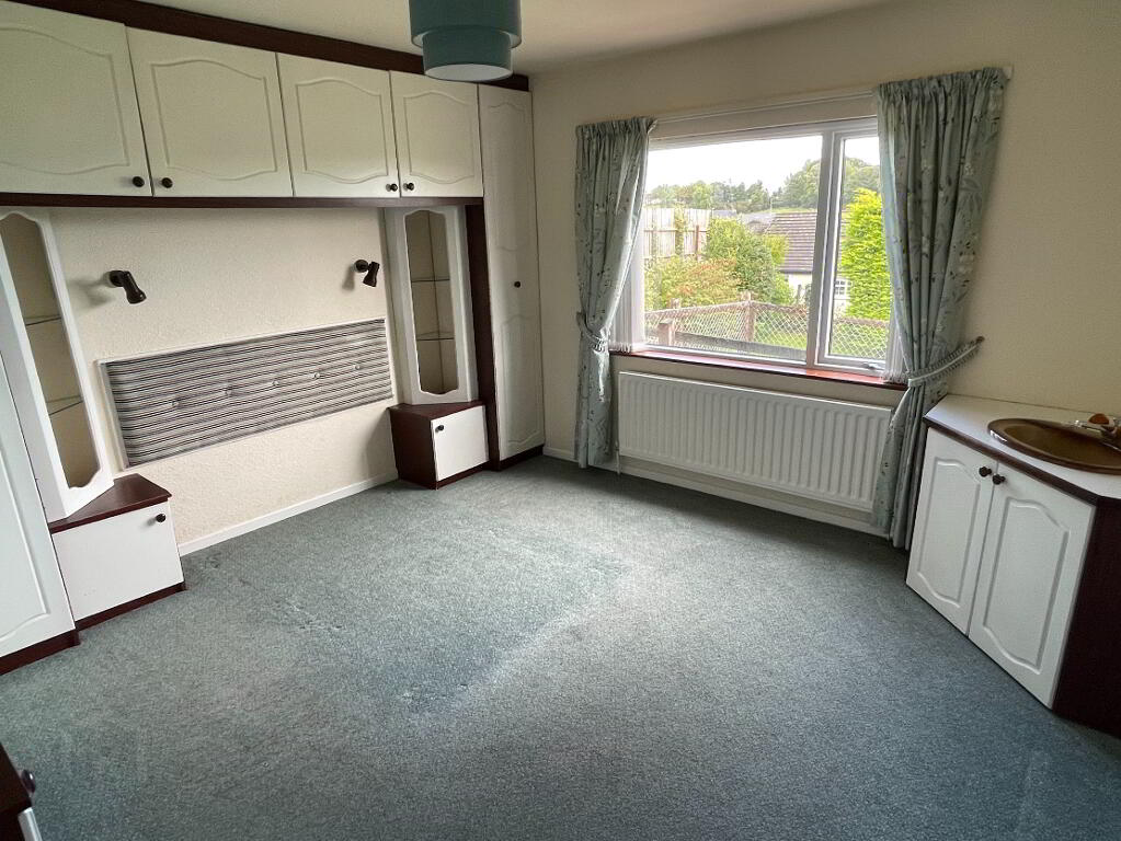 Centre light, carpeted, single radiator, built-in desk with storage cabinets and shelves, 2 double power points.