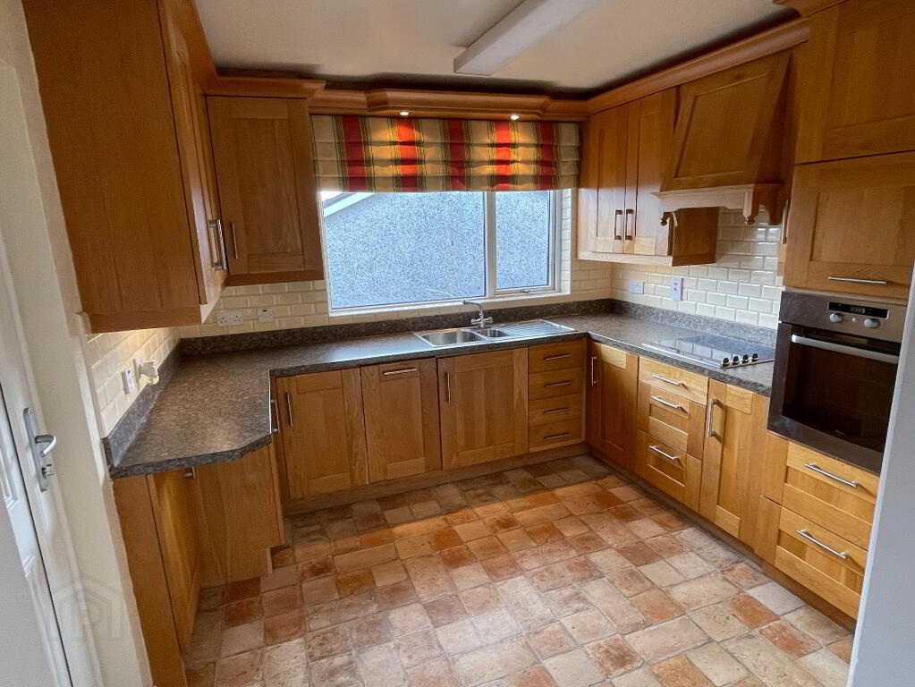 Centre light, Grant oil burner, stainless steel sink, plumbed for washing machine, space for tumble dryer, high and low level storage units, 1 double power point, window, UPVC entrance door.