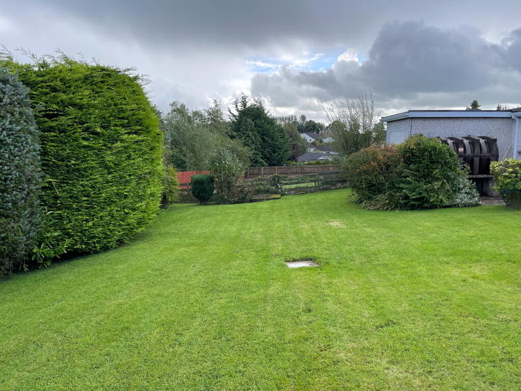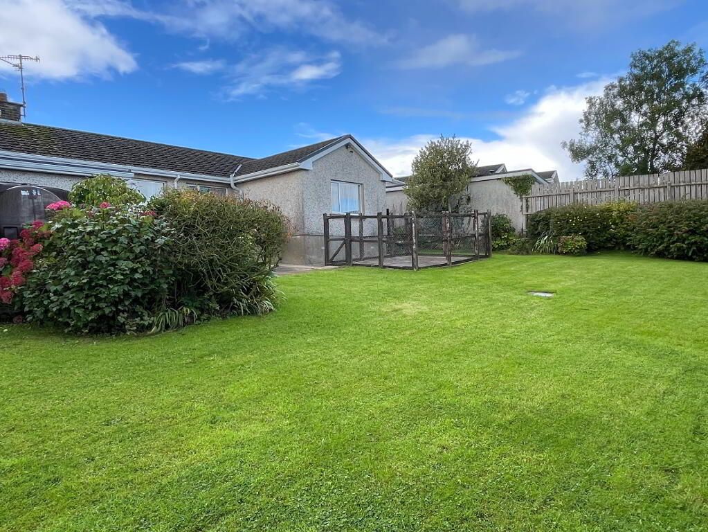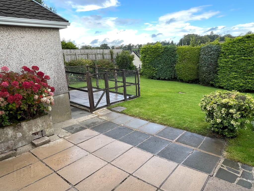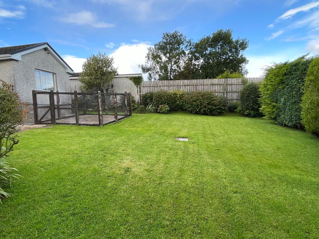 Paved patio area, oil tank, lawn fenced on 2 sides with hedge to other, dog pen, outside lighting, outside tap.
