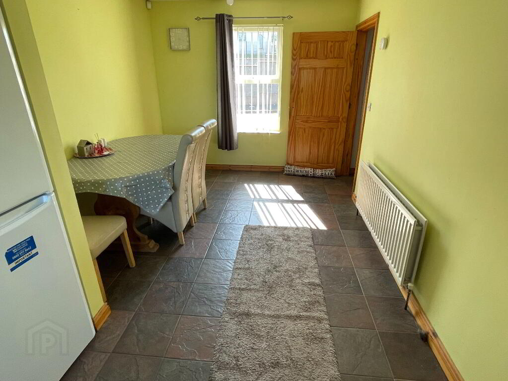 Centre light dining end, recessed lighting kitchen area, tiled floor, double radiator, 5 double power points, TV point, partly wall tiled, high and low level kitchen units, stainless steel sink, plumbed for dishwasher, integrated extractor fan, space for cooker and fridge freezer, thermostat.