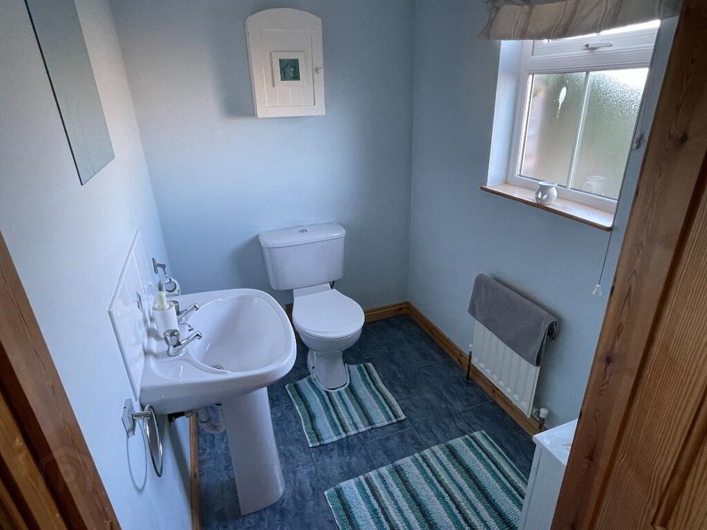 Centre light, extractor fan, single radiator, white toilet, pedestal wash hand basin, tiled above basin, tiled floor.